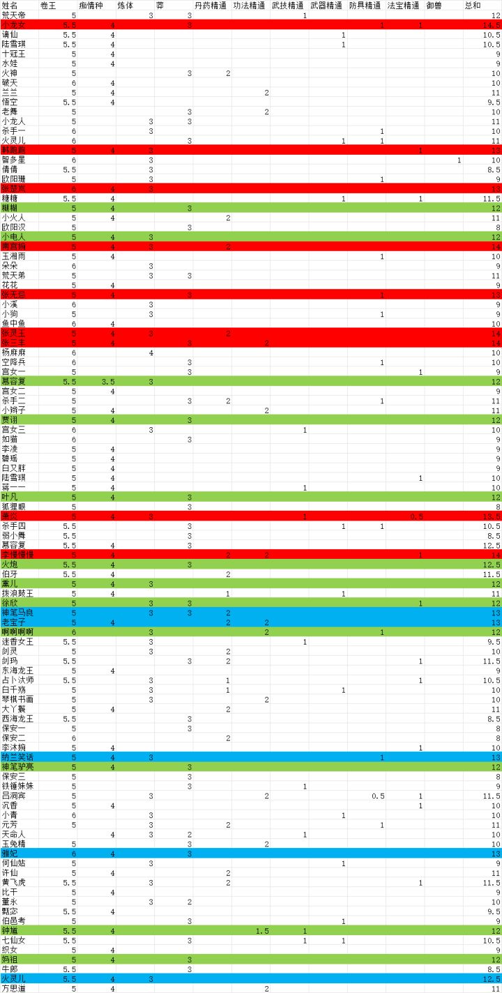 玩了快一个月了,突然发现大神们的好多攻略,今天在单位摸鱼做了个表,开除了一大批小菜鸟,把凑合用的都就下了,战力减少快2亿,哈哈哈,厚积薄发我把卷王9级的给了5.5分,10级的6分,因为这个技能实在太强了,8级和以下的给了5分,人物里最低是5级卷王,再低没发用了,其他评分参考500年大神和其他帖子,哈哈哈