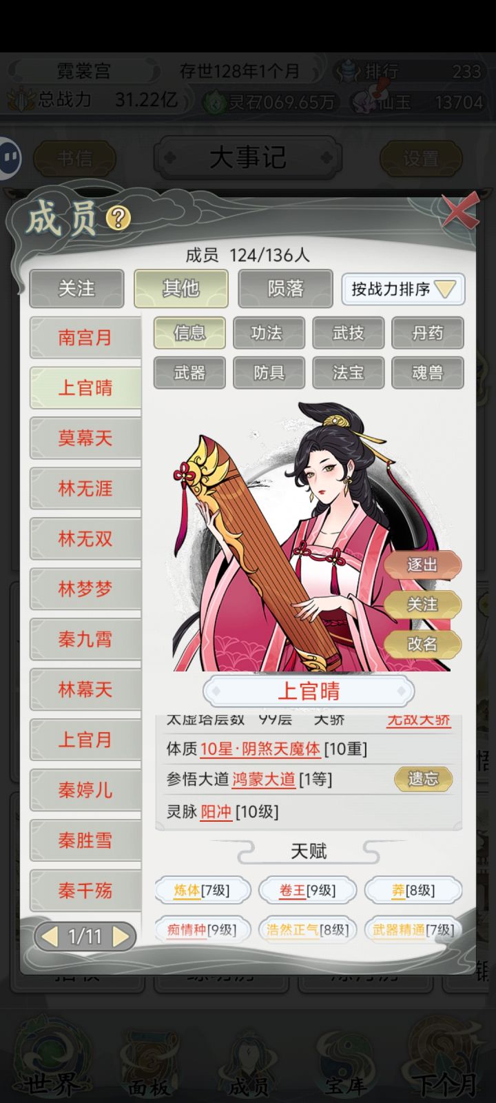 玩了几天刷了120多名弟子,卷王痴情莽三词条弟子20几个,其余都是卷王痴情双带不低于9