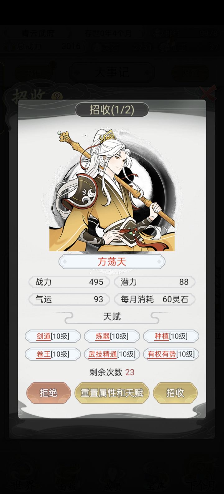 486的弟子,我是没见过有全红的。所以以前的号从来不招486。想着这个有三个天赋,而且可能是我最后一个号了,就留下吧。