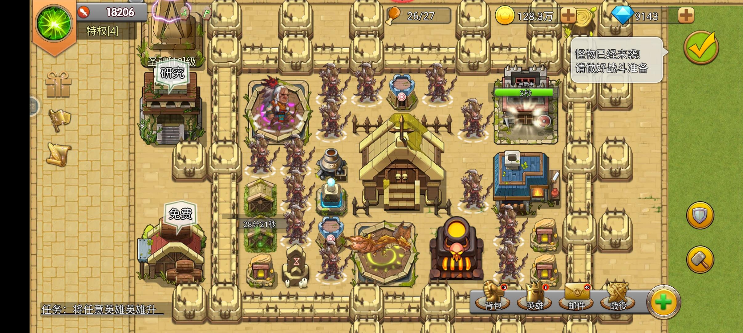 回归正题 游戏玩法:英雄是贯穿游戏始终的主要单位 但养成不易!其次是防御塔 经典永不过时的防御塔,没有人玩塔防不造塔吧不会吧?最后是兵种,是的,可以造兵摆阵!与城墙组合可以解锁一万种玩法!我用的是锤子兵3人口那个 根本没有对手!