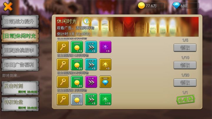 看到这个贴的玩家可以加一下官方的QQ群,群文件有攻略,群公告有惊喜金币和钻石旁边的➕号可以看广告获得资源,钻石广告固定100钻石,金币广告会随着你的金矿等级而提升礼包码兑换功能在游戏内头像里日常活动有个战力提升,等级高的城墙加的战斗力最多(因为城墙有很多个)锤子建造里面可以留几个城墙来应付战力提升这个活动(城墙建造出来会增加战力)障碍物如果影响到你的布局,可以进入英雄列表再关闭会刷新障碍物