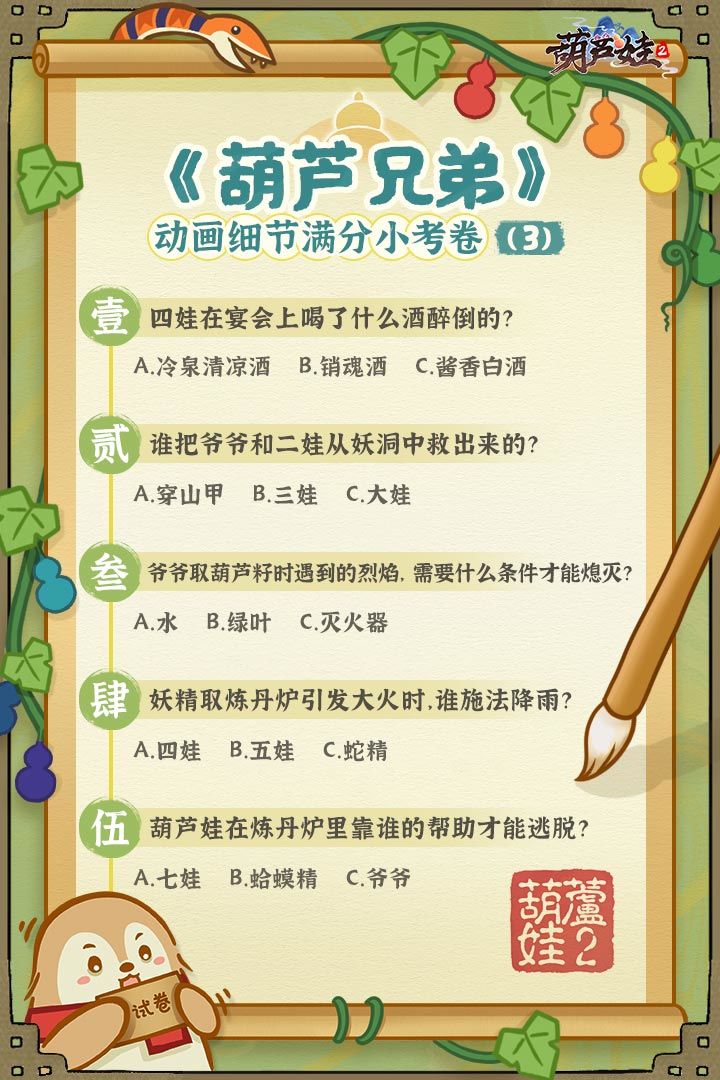 “(*^▽^*)”村民大大们,好久不见呀!哎呀,最近葫芦村里也卷起来了,当了村官还要考试,这不,出了一张《葫芦兄弟》动画细节满分小考卷(4),大家也来和甲仔一起来试试吧!满分5分,请认真审题哦!小考卷(4)答案将在明天公布哦,^_^大家先把自己的考试结果打在评论区吧!关注官方微博:@葫芦娃2手游关注官方微信公众号:葫芦娃2手游,微信号【hlw2sy】