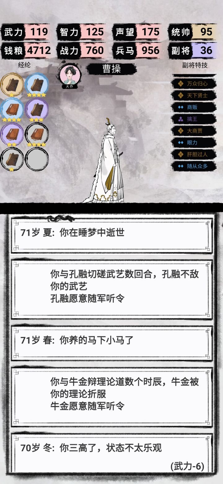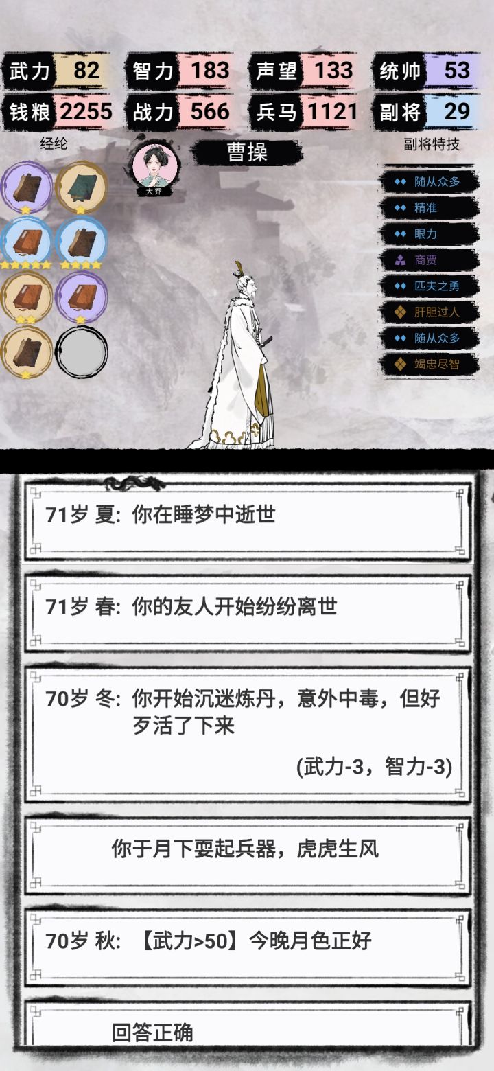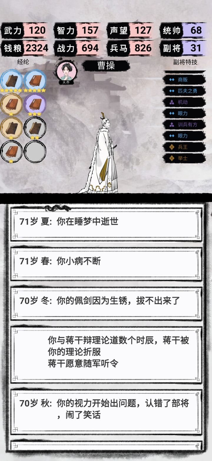 曹操自立为帝71岁梦中死亡大结局,无论你的武力多高。拥汉的话,皇帝把你扁了赐一杯毒酒(大结局)自己打自己可还行对曹操玩家极端不友好!