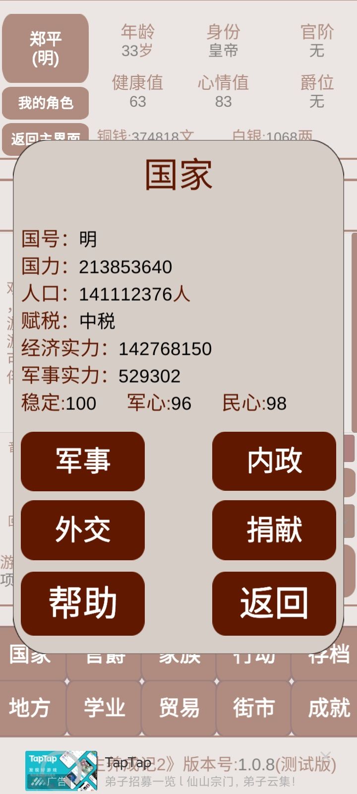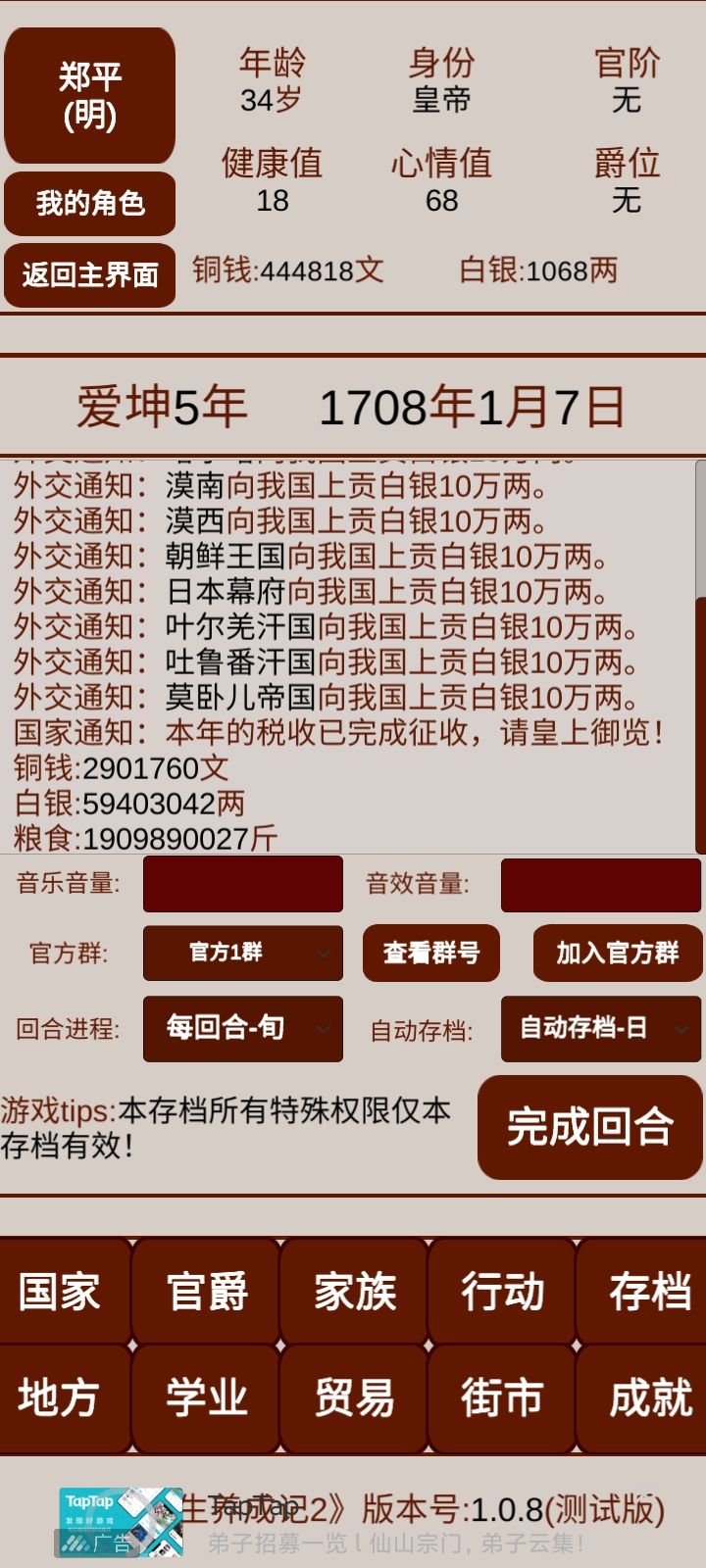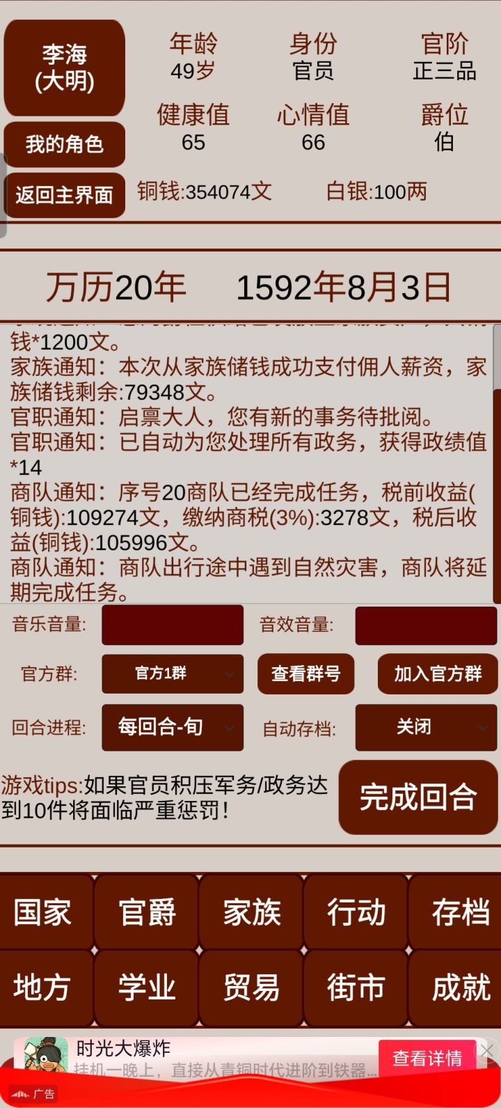 玩了10个多小时,分享几个关点:第一个,也是最重要的一个:商队收益是三大收益(商队,存钱,收地卖粮)中来钱最快也是最多的,前期猛猛发展商队,一直发展到每个商队都10万铜钱总值出发,但是回来缺变成9万,本来就挣钱不多的商队被百分之三的税收扣成连本金都陪不回来的情况,所以后期商队基本发展不了,连钱都挣不了,更不要说完成称帝目标了,其他两大收益慢到发颤,铜钱欢银钱差距太大,就靠挣得那一点钱根本换不了多少,玩的心累,所以我建议策划先修改一下商队这该死的税收,并且再多添加其他的挣钱方式,不然就靠这点收益玩到猴年马月也玩实现不了称帝