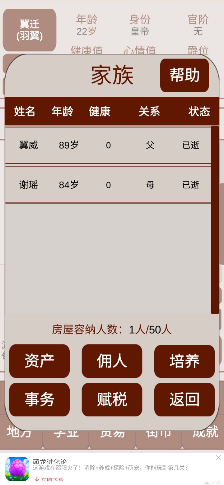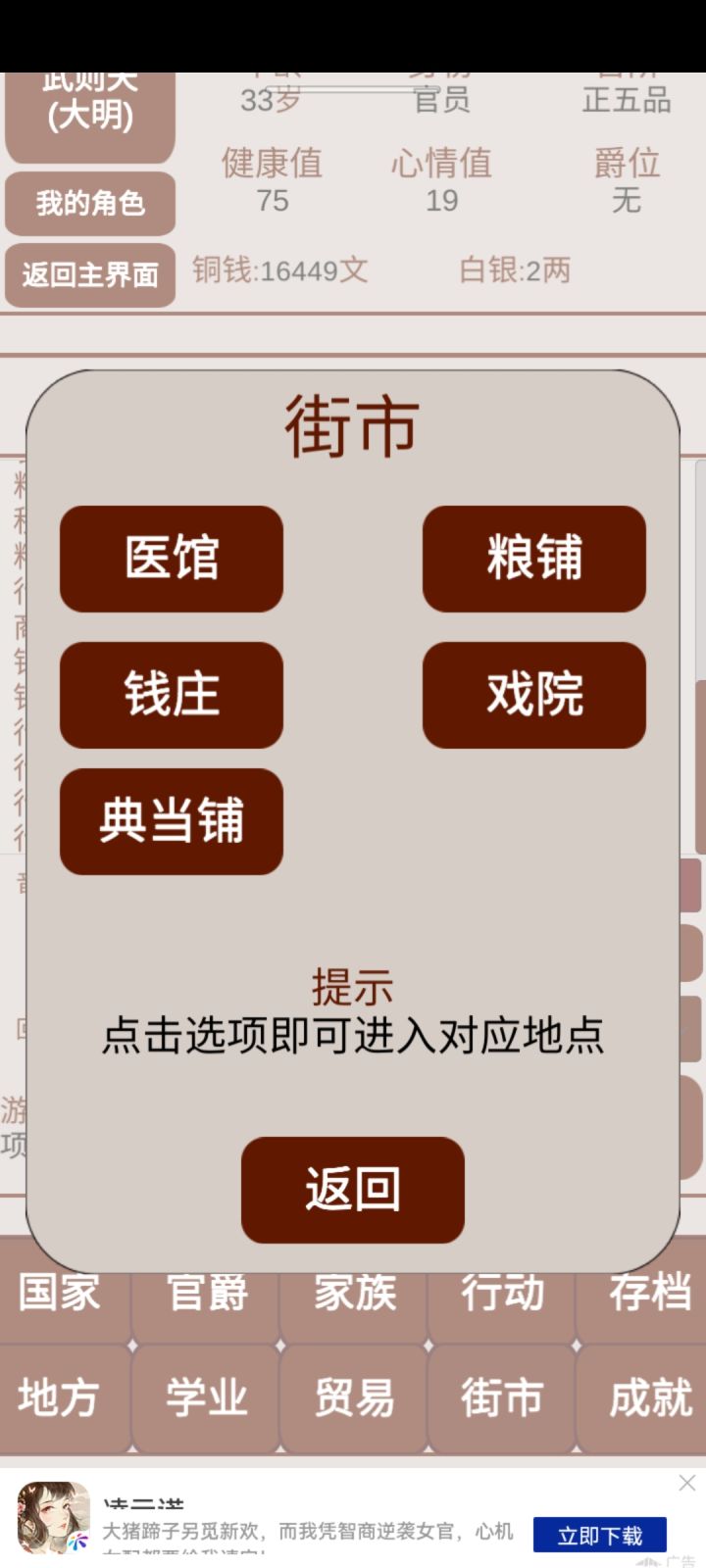 玩了10个小时,基本上你就摸透了这个游戏是怎么回事了。前作我没玩过,不过新作的确有许多需要完善的地方。这个游戏核心就是升官发财一统天下。有n多类似游戏的影子的大杂烩,前期还算有意思。这里教你些如何快速上手和少看广告的玩法。最后还有给策划的一些个人建议。1.生存篇。基础数值除了健康和心情你可以都不要管,实际是就是没有什么用,我不清楚多少岁自然死亡,没耐心测,反正七十多岁还是能活的。健康和心情为0就