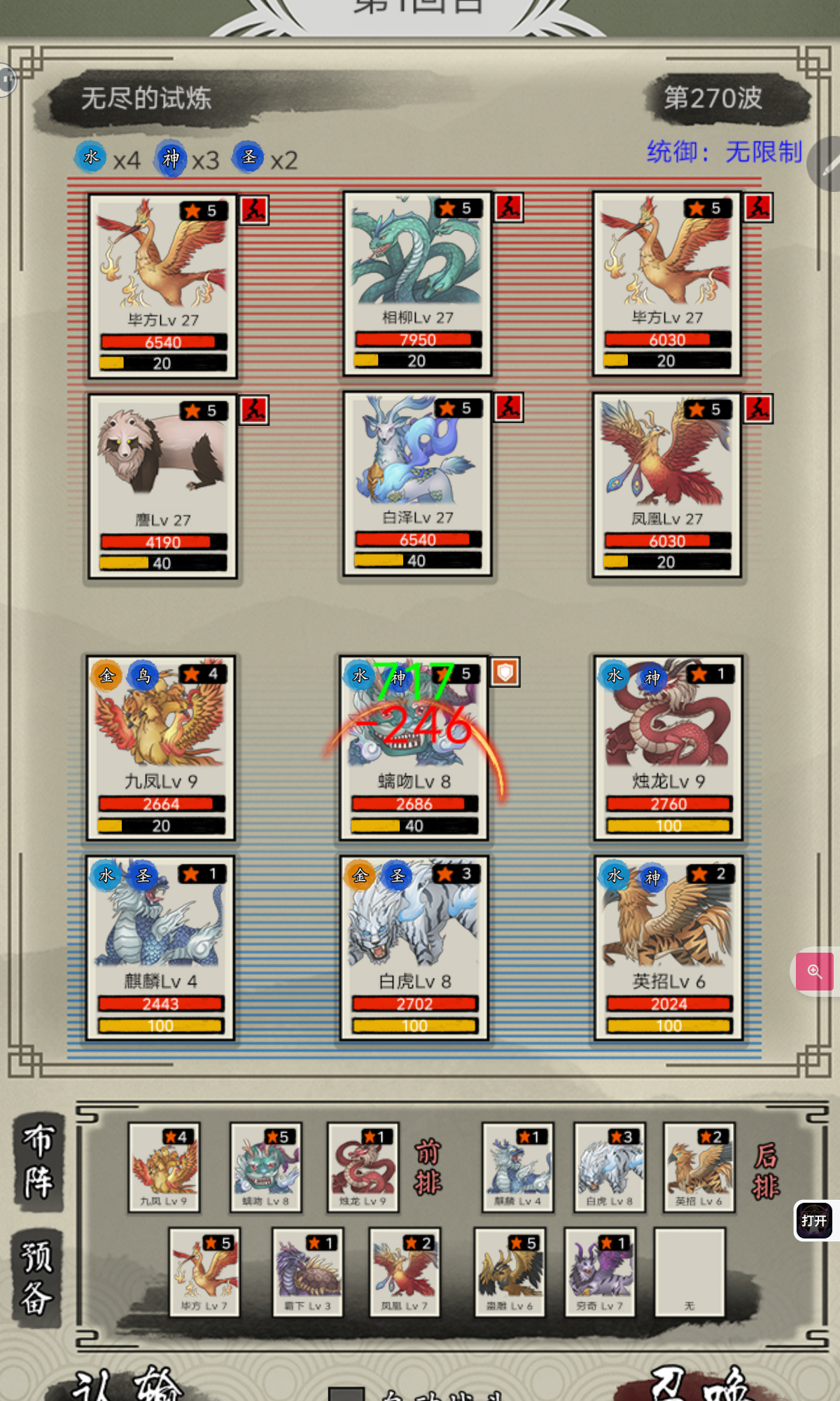思路是五御数量有限,可以拿三御补个位置,最好凑个羁绊(五星三御完全可以平替一星五御),把多余的五御名额集中在烛龙白虎和九凤身上。 五星选卡优先级(凑齐卡牌以后):烛龙(五星)>九凤(二星)>白虎(3星)>麒麟(一星,可用青龙代替) 三星抽卡优先级(全五星):陆吾>水麒麟(可用九尾代替)>(可代替麒麟凑羁绊) PS:此视频各卡牌属性方便除等级其它全满。