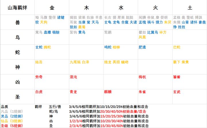 1.数值调整:为了让阵容搭配更加多变灵活,对缘分进行了调整,金、木、水、火、土五行加成数值不变,作用对象从限定属性变为所有上阵异兽。鸟类缘分调整为:上阵3、4、5、6名鸟类异兽时,所有异兽攻击增加20、30、40、50。兽类缘分调整为:上阵3、4、5、6名兽类异兽时,所有异兽生命增加200、300、400、500。蛇类缘分调整为:上阵3、4、5、6名蛇类异兽时,所有异兽获得生命恢复40、60