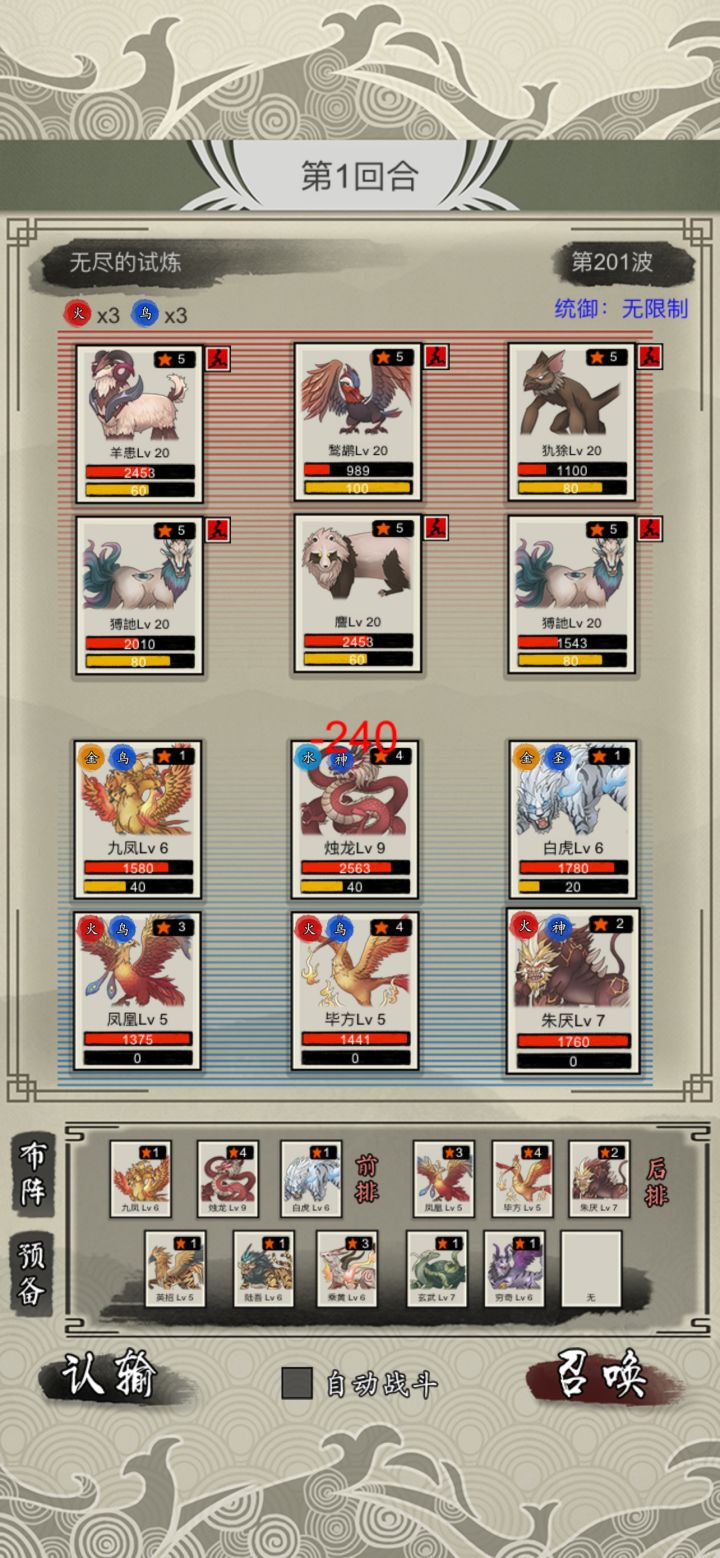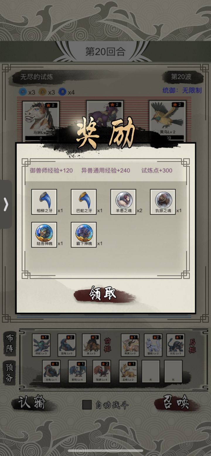 发表一下通关感受:这个游戏的大体思路,迅速推关,不关开局刷到哪个系的珠子,都要尽早开副本刷能量血攻击的石头,刷到都50%以上开始刷无尽模式,6兽开局,然后将主力都升到4级以上,一般就可以推过60关,你会发现副本有的无尽模式里全都有,无尽模式60关难度上一个大台阶,获得的资源和品质也随之提高,到120关就可以刷到所有资源,最关键的是有公共经验可以升级核心异兽。然后尽快刷20万试炼点兑换天道印。这