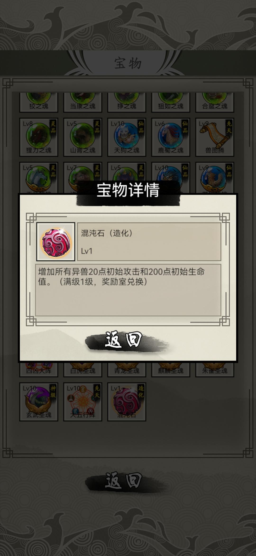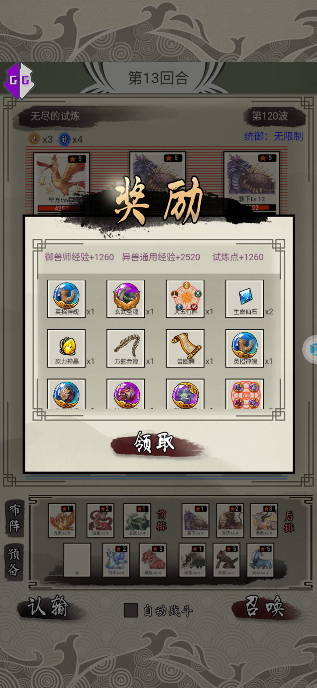 发表一下通关感受:这个游戏的大体思路,迅速推关,不关开局刷到哪个系的珠子,都要尽早开副本刷能量血攻击的石头,刷到都50%以上开始刷无尽模式,6兽开局,然后将主力都升到4级以上,一般就可以推过60关,你会发现副本有的无尽模式里全都有,无尽模式60关难度上一个大台阶,获得的资源和品质也随之提高,到120关就可以刷到所有资源,最关键的是有公共经验可以升级核心异兽。然后尽快刷20万试炼点兑换天道印。这