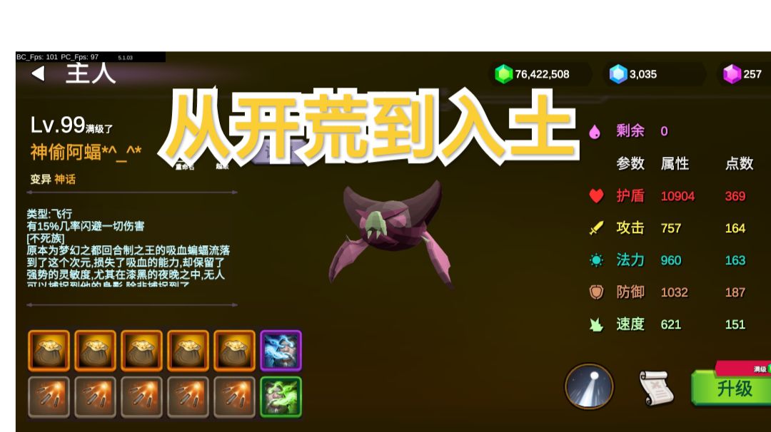 一、初始蜜蜂,亡灵,半兽人随便选一个二、一直普攻往下面打,到第五个图解锁寻宝模式,也就是和平抓宠模式,怪物名字后缀带有宝宝两个字冒蓝光的等级为1,其他野怪为当前地图等级且无自由属性点三、右上角指南针可以任意传送到已经通关的图,我们回第一关,不停的夺舍史珍香(看一次广告+3次),成功或者失败都可以加捕捉力四、左上角详情里面可以看到当前捕捉力,刷到Bi差不多30点的时候,夺舍后选择上一层,还剩的