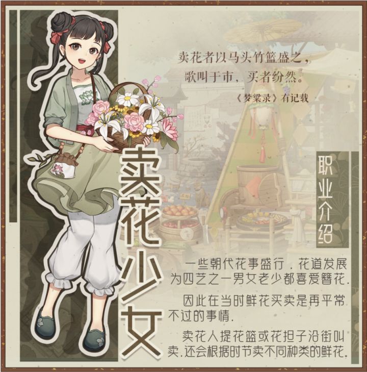 不知不觉就到了十一月的中旬,项目组在顶着锅盖吭哧吭哧地肝进度,小编痛饮奶茶续命,原地复活上来冒个泡~。锵锵锵!这次我们将展示的是游戏角色。接下来几期,他们将会陆续与大家见面昂。外形,性格和职业都有着很大差别的人物,将对故事发展有着或大或小的推动作用。“卖花啦~卖花~”活泼的青衣少女游走于闹市之中。不分男女老幼,镇上的人皆爱簪花。“今日这杜鹃花开得艳艳的,我一定能全卖光啦。”少女心里暗暗思忖。