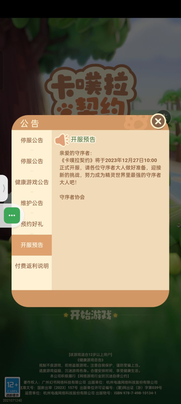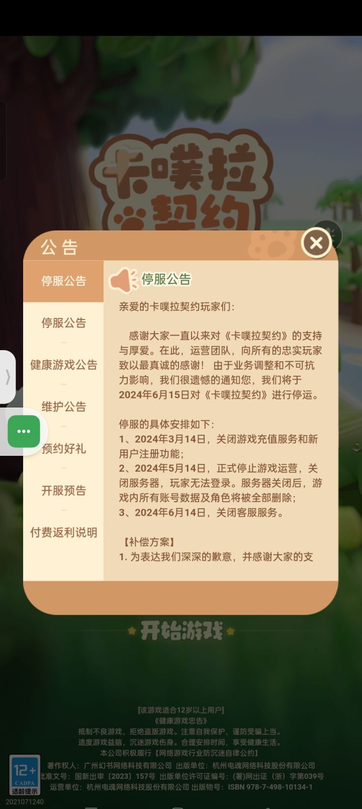 感谢大家一直以来对《卡噗拉契约》的支持与厚爱。在此,运营团队,向所有的忠实玩家致以最真诚的感谢!由于业务调整和不可抗力影响,我们很遗憾的通知您,我们将于2024年6月15日对《卡噗拉契约》进行停运。