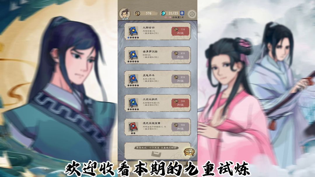 开局攒钱买个和尚,刷卡关刷到右上角的《仙踪秘境》出来,还有钱就点下功法“九转”加伤害,用和尚一直刷仙踪秘境,边刷边开应龙宝箱,其他宝箱就不用开了,主要拿应龙,刷到30层左右,用开箱子得到的钱升功法,先点满九转,其他随意。然后回去刷卡关,基本乱杀,不费力,拿新的功法。 到仙踪秘境35层以后,我会把角色换成肖凝,为什么要换,是35层秘境以后,小怪太厚了,比卡关的小boss没什么两样,用和尚那小光环打完