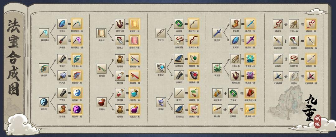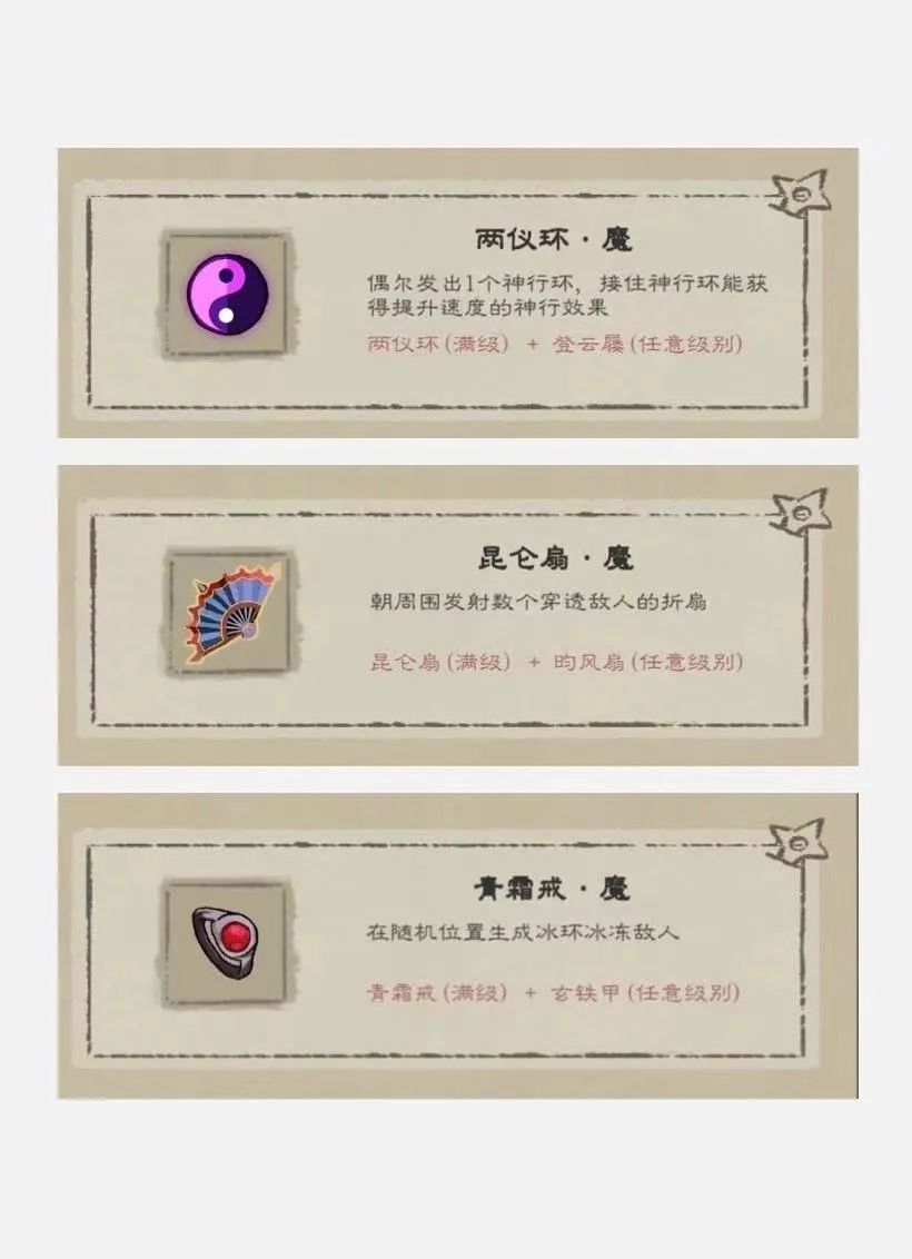 无尽画卷出来几天了,总结一下玩法。 一、法宝 1.初始攻击法宝推荐幽命匕首、缚妖索 前期好操作,后期转缚妖索·魔和幽命匕首·魔都很好用。 2.其它攻击法宝推荐:龙牙弓·仙、幻夜蒺藜·仙、三味火符·仙,昆仑扇·魔、镇狱雷符·魔、紫璃扣·魔、诛仙剑·魔、青玉莲·魔。 吸血功能非常重要,但是青玉莲·仙回血能力太差,不建议使用,直接出缚妖索·魔比较好。 考虑攻击距离、伤害和搭配问题,金刚符、翻羽拂尘、碧瑶