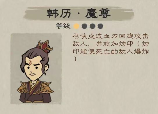本文首发【九重攻略组】公众号,未经授权禁止“抄袭文章”转载至其它平台。 哈喽大家好我是飞鹤,随着化身系统的到来让众多角色觉醒了化身功能,相信有很多小伙伴都还不是很了解,所以我就给大家带来了韩历·魔尊 的人物解析,大家快来和我一起看看吧。人物解析韩历·魔尊--召唤炎波血刃回旋攻击敌人,并施加烛印,(烛印能使死亡的敌人爆炸)初始法宝缚妖索。 韩历·魔尊化身后的新晋法宝炎波血刃可以进行全屏范围内的弹射攻
