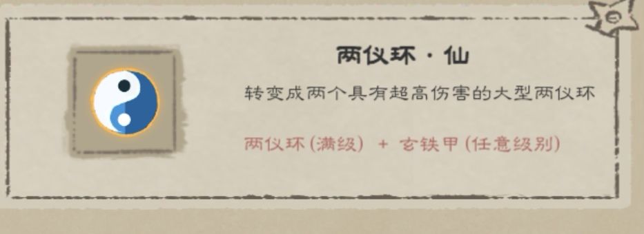 翻羽拂尘·仙 不间断朝最近的敌人攻击 翻羽拂尘(满级) + 玄冥石(任意级别) 翻羽拂尘·魔 散射攻击敌人,并附带1秒冰冻效果翻羽拂尘 (满级) + 天蝎镖(任意级别) 两仪环·仙 转变成两个具有超高伤害的大型两仪两仪环 (满级)+ 玄铁甲(任意级别) 两仪环·魔 偶尔发出1个神行环,接住神行环能获得提升速度的神行效果 两仪环(满级) + 登云屡(任意级别) 逐月剑·仙 发出一道威力强大的金色剑气