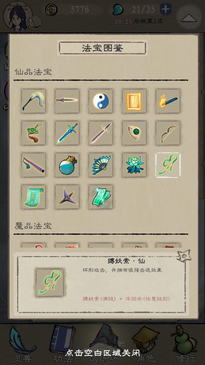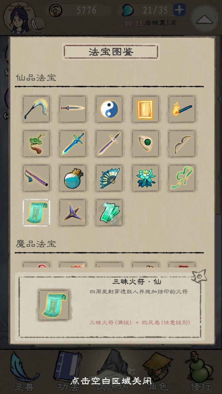 拂尘——比想象中更有用伤害能力一般,优点是可以自动处理最靠近的怪,而且超武合成材料是CD石这种万金油的东西,属于挂机时候可以点出来用用但也不至于特意去找。但是我在打高层的时候无意间拿过拂尘以后发现,反正都是伤害不够,那么自动索敌的特性能给我的走位带来很多空间,比想象中要有用一点。两仪环——什么都略懂一点攻守兼备的法宝,伤害也还行,保命也还行,清场开路也还行,这样在低层的表现就挺好的,而且合