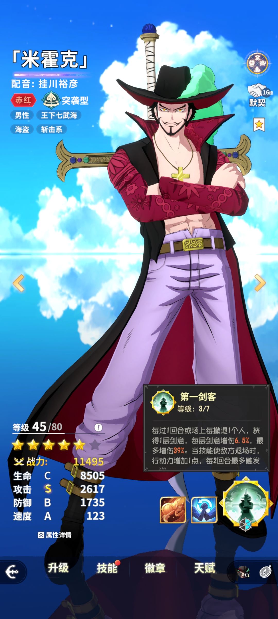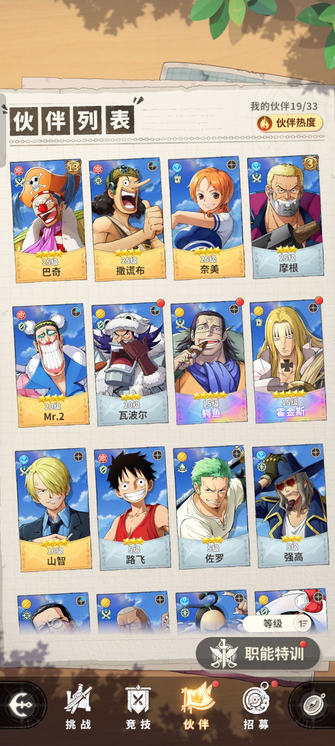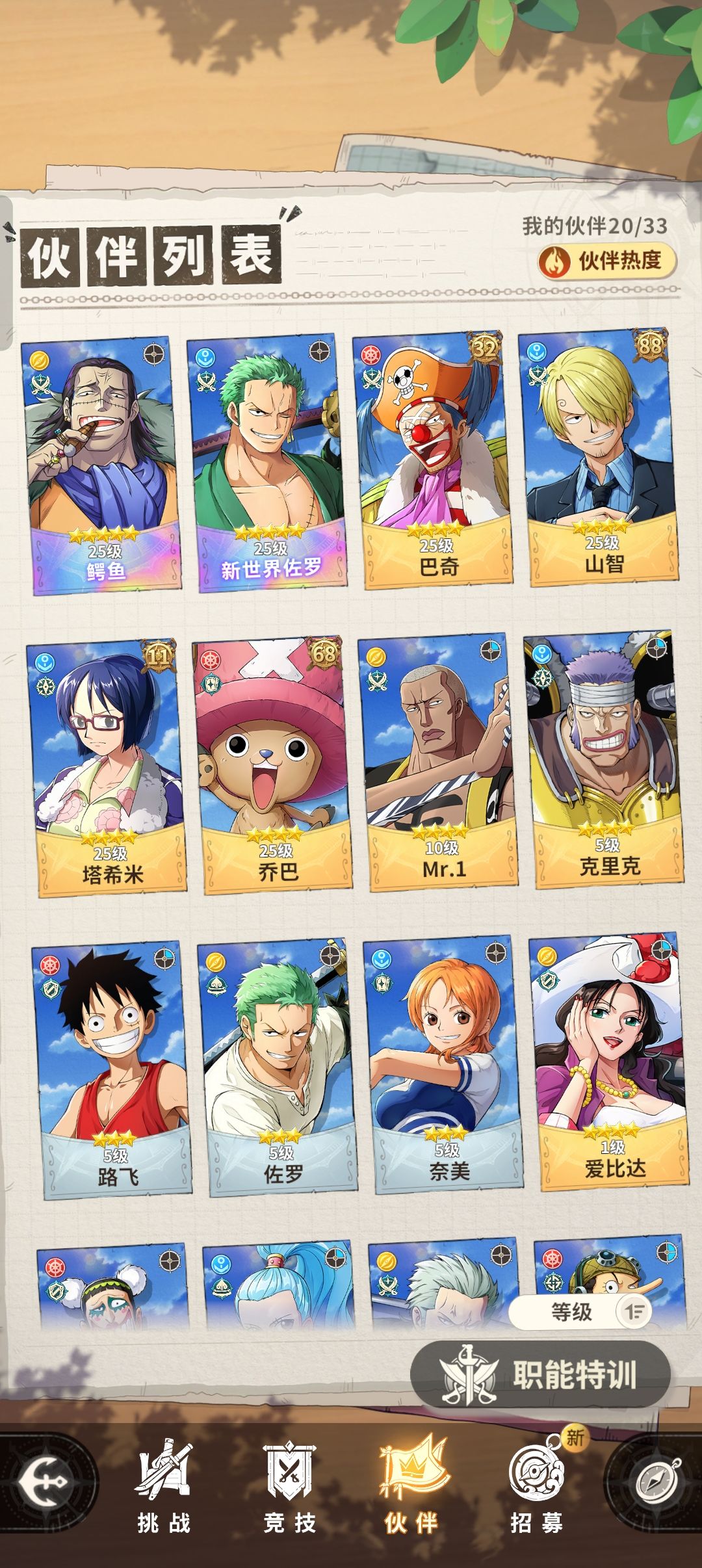 已根据wiki公测数据更新,游戏机制新颖,具备很多思考探讨的地方,根据上测体验的一些理解综合公测改动,列出以下伙伴梯度表。后面公测或公开多些资讯会再次更新: 带主观看法(同t度不分先后: t0:王女vv、鹰眼、基德、罗宾、霍金斯; t1:鳄鱼(配高命中vv时)、罗、艾斯、班吉、艾尼路、新世界路飞、新世界佐罗、山治(vv后排) t1.5:新世界山智、Mr2(开局加防御打反手)、乌索普、奈美、塔希米、