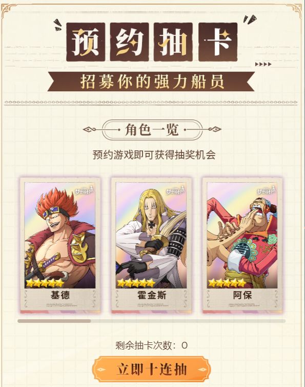 新手角色选择,新手玩家用什么角色能让你轻松开局?并且强度在线呢?游戏可以使用6名角色,3个为上战角色,3个是备选角色,在战斗中可随意切换,这里提醒兄弟们,新手阶段就可以拿到一个老沙,那么多出来的抽奖卷我们可以直接抽艾斯,给兄弟们整理下前期适用性非常高的角色,艾斯,老沙,薇薇,基德,塔希米,索隆,山治,还有我们新世界的路飞,其中老沙和路飞是稳定获取的,基德可以代替索隆,娜美可以代替薇薇,山治有特效。