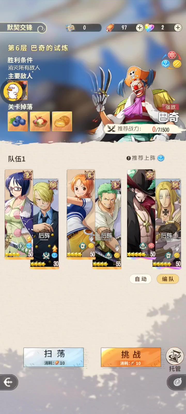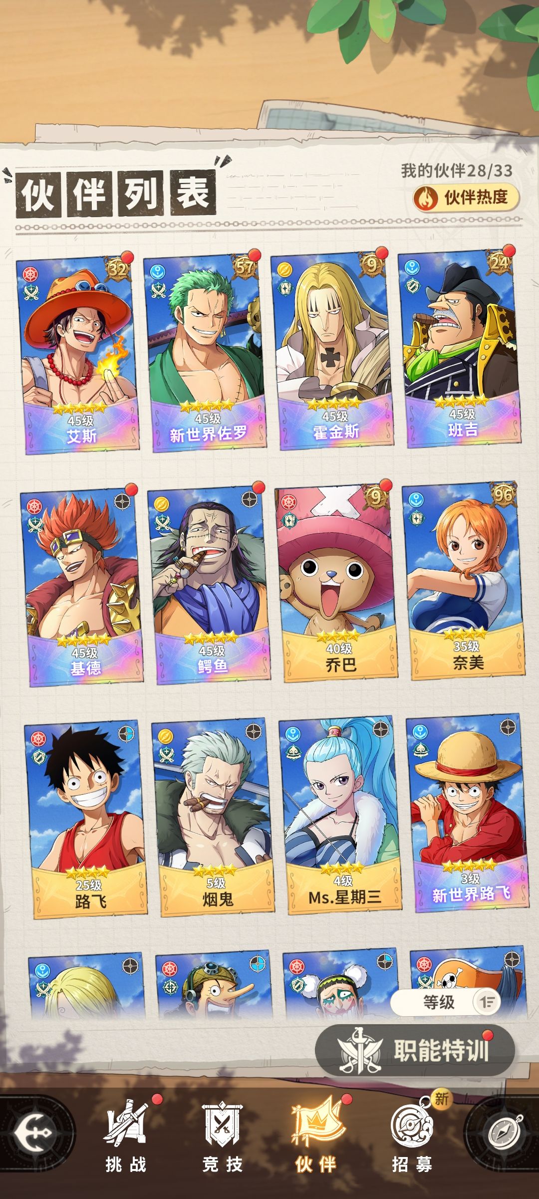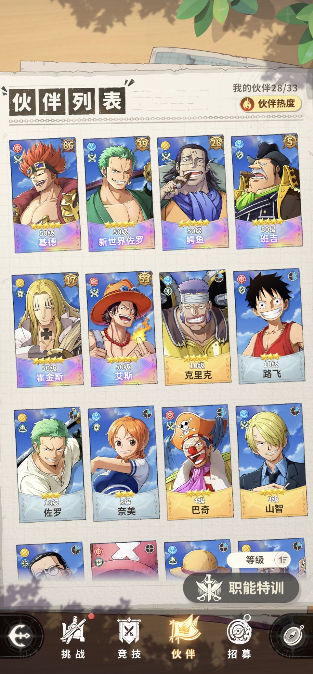 每日修行: ①雪之试炼:T0组合,薇薇加鳄鱼(艾斯) T1组合,娜美(霍金斯)加鳄鱼(艾斯) ②巨人试炼: 推荐上阵蓝色本,T0:新世界佐罗、新世界路飞、薇薇、班吉 推荐上阵红色本,T0:基德、满命鹰眼 推荐上阵黄色本,T0:鳄鱼、霍金斯 ③船长试炼: 巴奇:T0,新世界索隆、新世界路飞、班吉、霍金斯 克洛:T0,基德、霍金斯、满命鹰眼、满命汉库珂 克里克:T0,基德、霍金斯、薇薇、鳄鱼、新世界