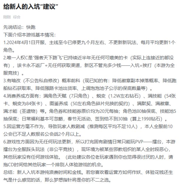 先说结论:快跑 下面介绍本游戏基本情况: 1.2024年4月1日开服、主线至今已停更九个月左右、不更新新玩法、每月平均更新1个角色。 2.唯一人权C是“强者天下路飞”已持续近半年无任何可媲美的卡(实际上连接近的都没有),该卡永不返厂+无任何获取渠道,新区不管充多少钱——入坑=挨打(本游为全服竞技)。 3.有暗改(不公告私自修改)概率前科(现已知的有:降低徽章副本掉落概率、降低跑船钻石获取率、降低强