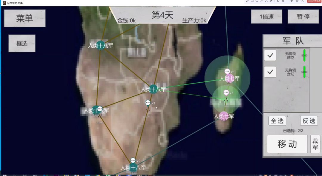 开局先把战备换成生化兵,以免来不及换。 等到下方两个秦兵都离开圆圈的瞬间,全体进攻下方。 这时候,上方的秦和右方的齐会同时进攻你的城池。 不要慌,这个时候你会发现你的远程兵卡在了城池的左下角,秦兵和齐兵会先打起来。而你的远程兵会处于无压力输出状态,你只需要不停的拉扯近战兵就行。 当下方的秦兵一死,立马指挥全体兵会城,不然城池会被瞬间占领。 这个时候金币刚刚到2,立马召唤一个黑色武将的生化兵,最艰难的时刻就度过去了。 剩下的只需要注意两点:1,在统一右边领土之前不要花钱升级城池,钱全拿去招兵,越快统一越有利。 2,不要死守某一处领地,因为前期王剪那一波很难抵挡,即便拿黑色武将都挡不住,毕竟只是a级生化兵。该撤退就撤退,然后再以兵力优势占领回来就行。我中途就是拉扯失误导致黑色将领牺牲了(→_→)