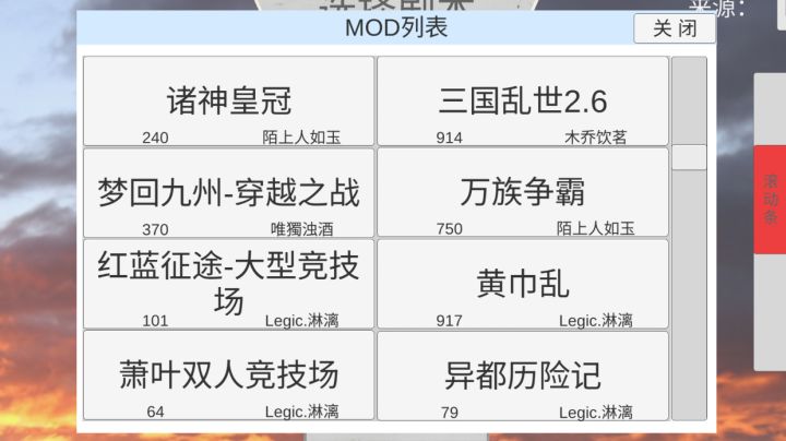 1.黄巾乱作者:legic淋漓尺寸:中中国图2.萧叶双人竞技场作者:legic淋漓尺寸:小双人公平小图3.异都历险记作者:legic 淋漓尺寸:中小虚构图4.文明冲突作者:怕是有病尺寸:中大虚构图5.群雄讨董作者:秋天落下的枫叶尺寸:中大中国图