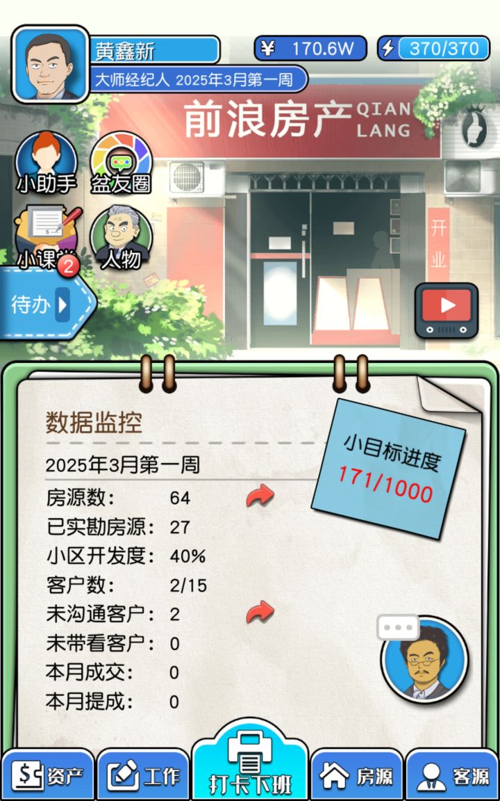 我曾在某北方城市做过两年二手房销售,里面很多情况都是现实里会遇到的(就同事不会像游戏里这么友善)。特别是有一些名词的解释,以及把最后议价签合同阶段设计成两方对战,真的很有趣。我觉得做pc版去销售都完全可以了。要保证你的房源充足,选择几个小区打好关系,你的房源和客户就不会缺了。还有就是了解需求后感觉没有合适房源的客户,就赶紧推给你的同事吧。给客户介绍房源的时候老是会误触到转让客户,本来可以卖出去的顾客就给转让走了,特别是前期本来就很穷,本来可以卖的这下提成也没了就可难受。建议转让顾客加个是否确认转让(╥_╥)。剧情挺不错,考虑做成文字剧情游戏?做成一个完整的故事,或者奋斗史,我觉得都挺不错额。玩法这块也还行,但是玩久了容易单调乏味,可以再改进改进。UI交互有点不科学,返回主页和打卡下班就不应该放在同一个位置,房源界面的返回按钮放左上角也有点反人类,根据一致性原则建议返回按钮(包括返回主页)最好还是统一放在右下角。暂时就说那么多吧!另外个人觉得收入来源可以把从广告想办法做成买断,定价也不用太高,个人感觉想讲故事的游戏如果要不停看广告才能继续玩儿,非常影响游戏体验,玩家看广告都暴躁了,还怎么去感受游戏想要传达的冷暖跟温情。当然这只是个人意见,可能比较片面,仅供参考。