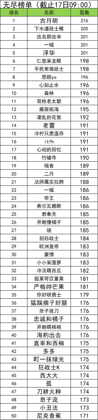 外挂封禁名单公示如下:干净的无尽榜单排名如下: