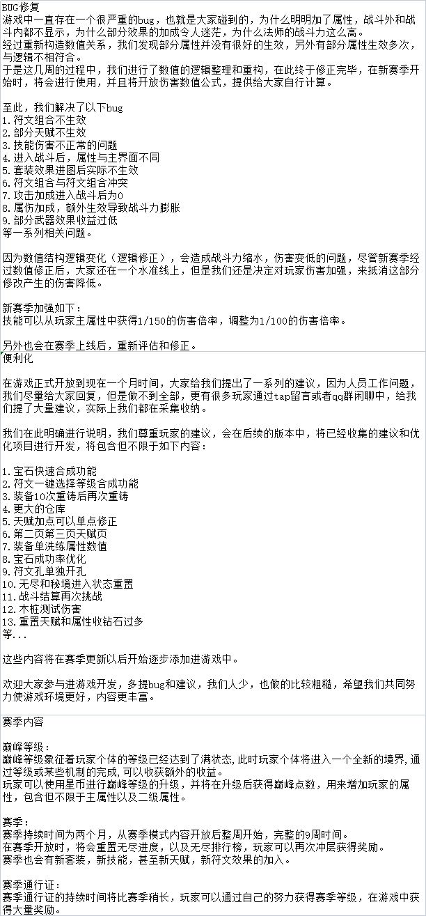 搞完了,终于提交审核了,不知道什么时候可以通过。先不等了,稍后邮件给大家发下补偿,再次表达歉意。补偿内容:官方补偿:【晶币】*1000策划萌卡补偿:【悔恨符文组】一套程序员补偿:【复活币】 *10美术补偿:【深渊钥匙】*20同时,预告一下更新内容:1. 全技能加强白色技能:不动蓝色技能:不动紫色技能:伤害基数从6提升为7.5全技能伤害提高25%橙色技能:伤害基数从10提升为