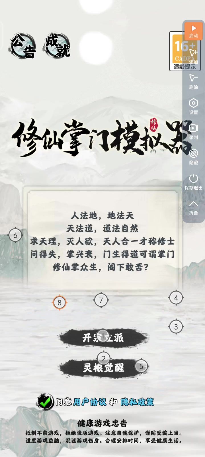 整体来说 前期发育还是比较简单的 天赋无脑选金色 先把剧情摸通 中后期基本都在点点点 玩了差不多三四个小时 资源应该是没有上限 推荐帕金森患者玩 【新手推荐】 1.开局刷灵根 三次过后没有(!单灵根!)直接退游戏重新进 天赋无脑金色 2.招成员一定不要招双灵根以下的 (不要追求全员单灵根 前期招成员比较少 )除非你想让你的成员后期死的快 3.体力不支突然暴毙是宗门活跃度不高 适当让自己提升一下境界