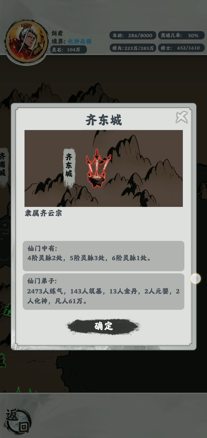 先上作者通过的图。 首先目前这个版本(2023年3月的版本)根本不可能完成的成就是500年通关的成就,除非开科技。就算800年通关成就也不是一般人能完成的,所以出一个800年的简易攻略。 作者这里加一个流派【重伤流】【重伤流,简单的说就是伤而不死,化剑峰前面可以用金丹以及以上的用重伤流,化剑峰以及之后的就必须元婴以上了。】【记住重伤流不能去打会报复的城池,不然会死伤惨重,这条信息修改余2024年3