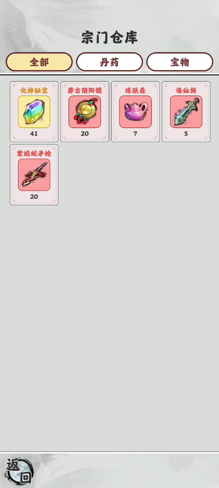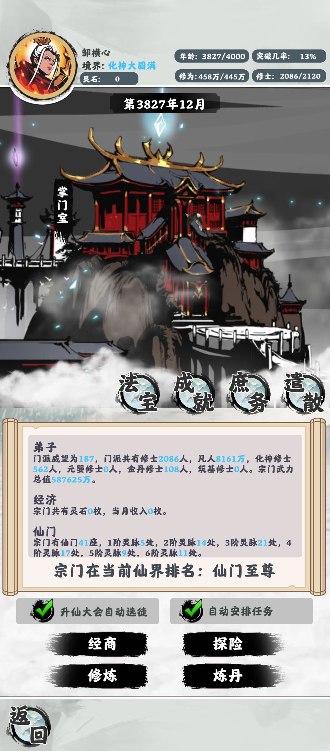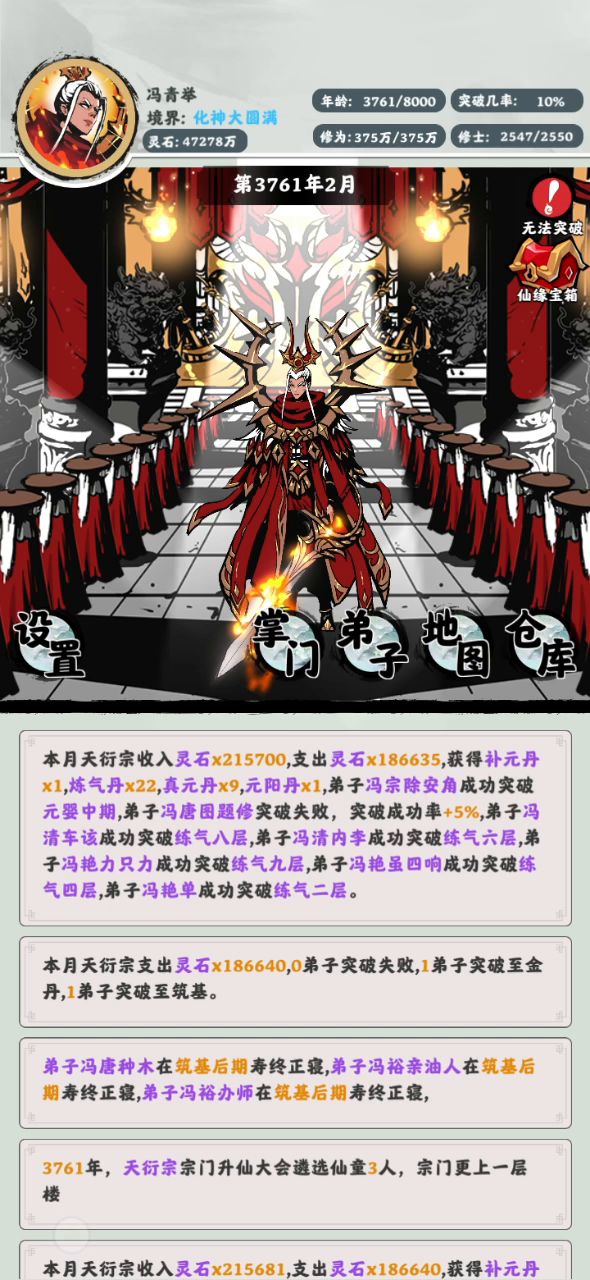 先放图 说说怎么打 1,别管灵石,一个都不需要,因为这游戏有个bug,你就算没有灵石遇到需要花的时候也能花的出去 2,全部炼丹,但和主流攻略不一样,不要去卖 3,弟子所有人都要,灵根无所谓,咱是丹药化神 4,开局打了几个筑基门派之后掌门到金丹,就一直挂机炼丹,但不要用,等80年左右之后,练气的弟子都快死了,就全部遣返,招新的培养,大概搞点金丹的就再把金丹门派打了,然后就是循环,每次要培养练气之前,