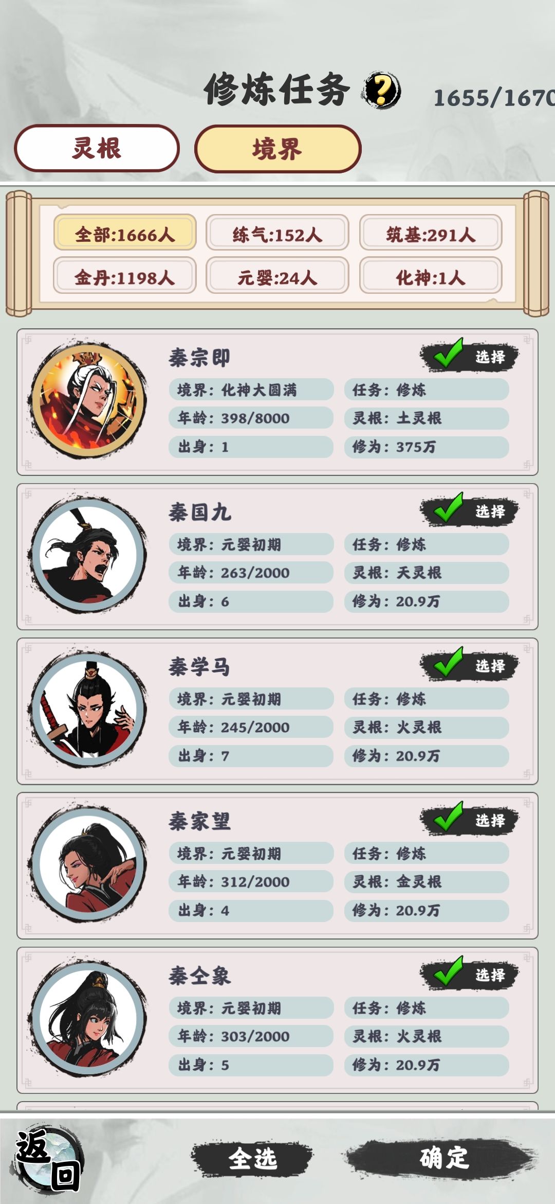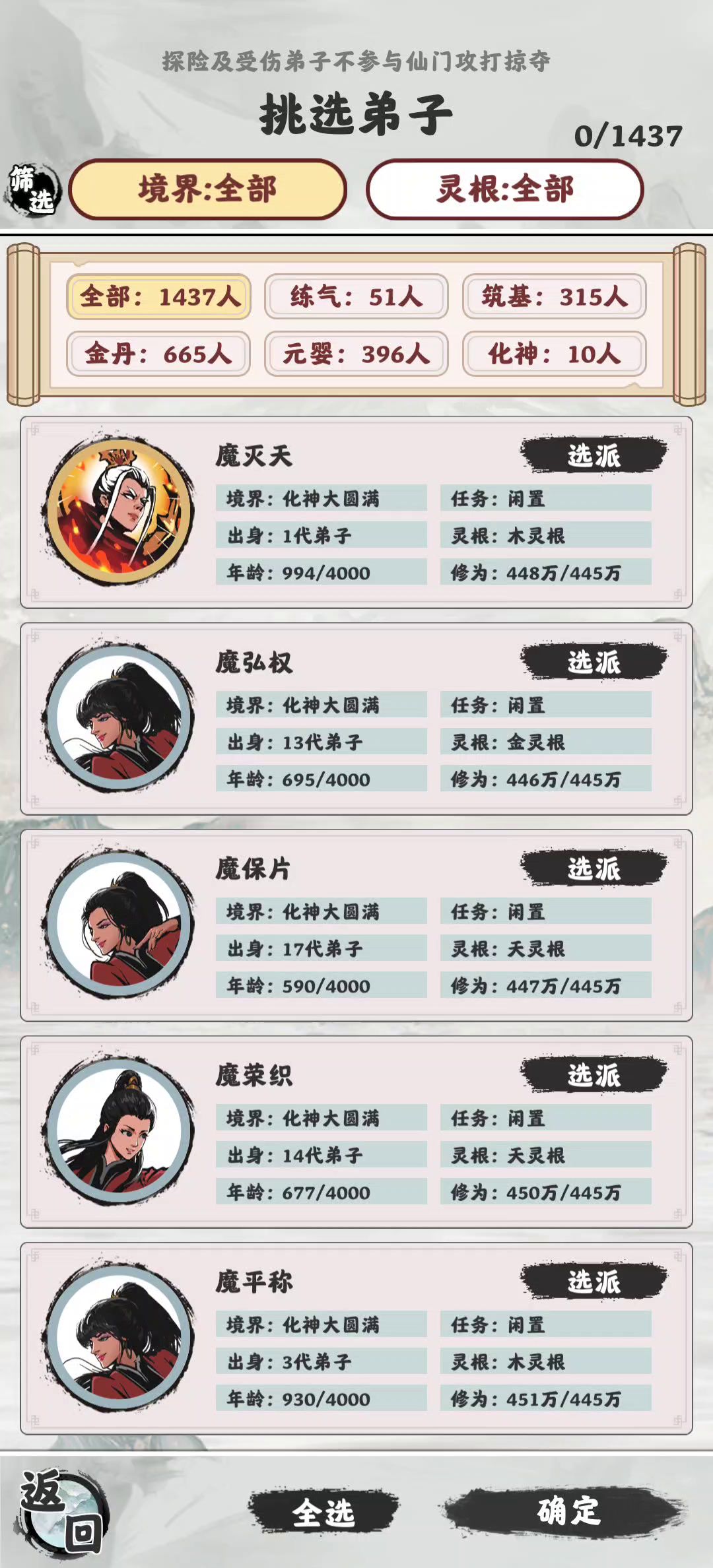 进入游戏后看两次视频,把单灵根和灵根祝福增益拿了。 天赋首选加群体战力的太阿剑阵,次选增加战力和增加丹药的,其他增益不大。 进入游戏后,走完事件流程,点击掌门,勾选升仙大会自动选徒,自动安排任务,点击遮务,自动安排任务只选修炼,前期以修炼为主,丹药和宝物赏赐全关了。 没钱了,境界高的去经商赚钱。 每年新招的练气一层3、4灵根和杂灵根弟子用来探索地图战力。 第一阶段目标,思过崖、黑河峰、仙林