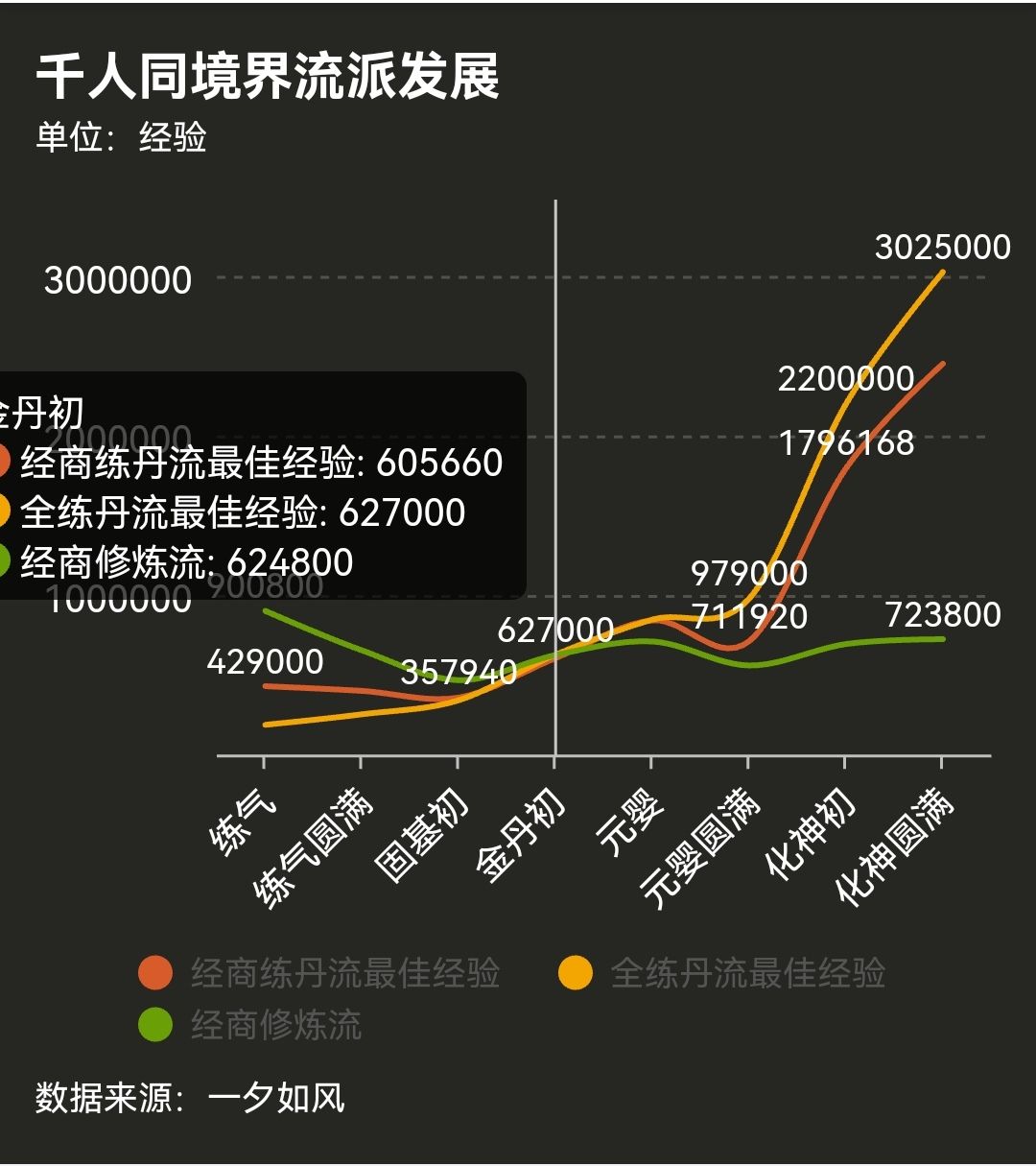 有通关过的有人护驾阶段1很容易过 阶段2 天赋性价比最高就是太阿剑阵全体百分之8战力 九星坊 1751 北烈山 1775 楚恩城报复 9900 博森城 1960 魔云峡谷 2141 血修井 2168 博林城 2359 博森报复 7100 博木城 2475 破财消灾 扣剑山 2762 扣剑报复 8400 莫问谷 3251 楚恩城 3284 楚恩报复 9900 阶段3 离火城 8502 风息谷 10385 南楚城 10896 南楚回打 33000 元炎山 11303 元火山 11330 问剑山 12430 元焱山 17623 纹蛇平原 21498 阶段4 化剑锋 65326 齐南城 71000 齐北报复 220000 齐北城 63800 齐东报复 240000 传功锋 105582 齐云城 92585 天地锋报复 333000 天地锋 110618 执法锋 115469 齐东城 78997 庶务报复 363000 庶务锋 120435 传功报复 363000 五灵锋 133983 醒狮谷 487961 先杀不会报复的回头在杀会报复的数据可能战力有点偏差可以高个百分之5打 时间越久战力需要越高 数据还在更新中 每个阶段打完可以稍微调整一下 接下来说一下基本长见的数据 经商 灵石收入 高修为经商性价比最高 每1500修为有一经济 灵石支出 练气一层到8层消耗1灵石 9层圆满消耗2灵石 初阶 中期 后期 圆满 固基 8 8 10 13 金丹 35 36 40 50 元婴 90 120 150 160 化神 350 420 600 800 练丹 看境界 练丹每个月17经验 每年1月不能练丹55经验 消化灵石的话可以把经验产出加练丹产出 以下是丹药产出 练气一层每月17经验产出 练气一层到圆满每月23左右高层练气 固基初阶每月产出31经验 金丹初阶每个月57经验产出 元婴77每个月元婴圆满89左右 化神初阶200左右 化神圆满275左右 战力初阶性价比最高 想最快提高战力就突破高战力 修炼 尽量让单灵根修炼每个月77经验 经商和练丹只有17经验 探险 每月55经验 有装备进去探险性价比才最高 拿个800年速通成就有15件红装 掌门可以单刷3阶 装备多了就4阶 经济灵石总结 经商收入 日常支出 练气 0~5.3 1~2 固基 12~45.3 8~13 金丹 82.6~175.3 35~50 元婴 308.6~638.6 90~160 化神 1106.6~2966+ 350~800 经商养活同境界人数 要修炼或者练丹减1就是发展力量 练气一0 练气圆满2.65 固基初1.5 固基圆满3.48 金丹初2.36 金丹圆满3.5 元婴初3.42 元婴圆满3.99 化神初3.16 化神圆满3.70 所以大部队经济不够的时候就按发展系数走 经验总结 平均元婴后或者齐云后全练丹 每突破一大境界能力大幅提升 练气经验0到8000 突破加1万 须修为8000 固基1.84万到6.8万 5.6万 4.96万 金丹12.3万到26.3万 20万 14万 元婴46.3万到95.8万 69.2万 49.5万 化神165万到445万 不计暴毙成本平均经验 平均升级一大境界成活7成 练气到固基1万左右 固基到金丹7万 金丹到元婴19万 元婴到化神65万 突破每个境界扣不一样 练气到化神初 假如百分百突破 共须69.26万 战力有太阿剑阵加成 战力 和修为境界有关 练气114~9235 每修为境界加成 固基4.84万~11.6万 1.72 金丹31.6万~67.4万 2.57 元婴178万~367万 4.082 化神957万~2572万 5.8 大后期40亿战力以上修炼的人少就可以不用修练了 全部练丹经商也不了直接吃药 按数据最大化基本能800拿