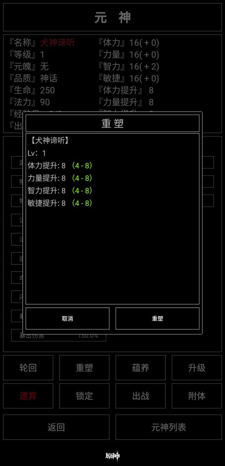 礼包码老生常谈的就不多赘述,领完以后商店里用 2023福气到 换 小兔元神 , 小兔元神 再和同样礼包码送的 诛邪元神 进行融合进阶该元神的力智体敏成长值分别是24,24,16,16。每给元神升一级就可以增加相应元神属性值,开启元神附体可以获得元神一半的属性。[注意不要给附体的元神升级技能,元神技能给的属性附体享受不到]在商店中用金币兑换元神重塑石,物理玩法把 力体敏 尽量刷满,法术玩法 智