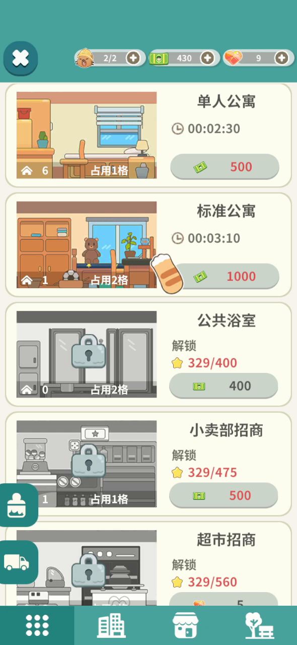 我明明买了单人公寓,但是没有显示,钱也没有退,之后再进就变成这样了,退出后台几次都是。我本来想等钱够了,再重新建造一个,这样也不行,因为除了“建造”,别的都点不了,也没有离线收益。哦豁,就卡这了。