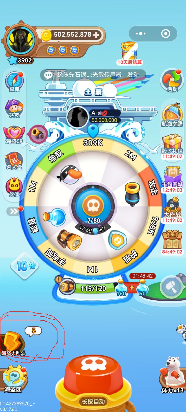 为什么我的小号一直没有这个海盗大乱斗,这游戏这么神奇,大号上来就有,小号除了转盘就只能转盘,无语了