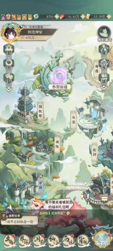 这游戏已经持续玩了小半年了,看了一下有140天了,目前境界是灵人大圆满。中间也是有时候偷偷懒,比不上大佬。简单说说个人攻略体会。 坚持 第一想说的就是坚持,坚持下去,熬走了大佬,然后你就是大佬了。 每个月都有签到福利,在游戏页面有,点进去,签到14天就送888仙玉和法宝或者宠物,很划算,一定要白嫖 还有就是主页福利小狮子那,每天领取和每周领取,还有就是每个节日活动周期内可以买较大的福利礼包,买全部