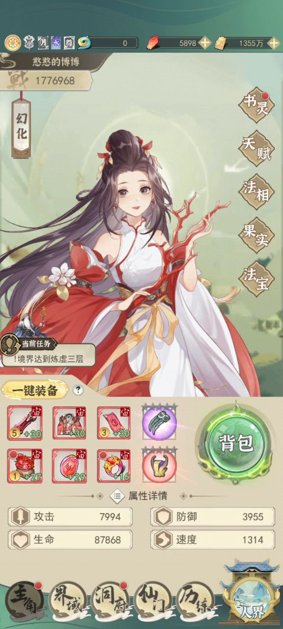 1.开局自选法宝神话选光阴瓶,传说选霖仙盏,史诗选玉人瓶。自选宠物选土巨灵。自选法相选重土紫薇。 2.第一天理论上都可以达到化神阶段开启斗法大会,荣誉奖励在人界都拿来换青龙徽章升级今雪堂, 3.郊游每次刷新出满星再用。 4.魔窟每天都有三次助战白嫖太白。 5.人界坊市前期灵石买的全买,仙玉买的只买修为钥匙。虚空石仙玉买的可以买几天就不买了。 6.每次突破大修为游商都需要重新加购。只买礼物,玉魂,修