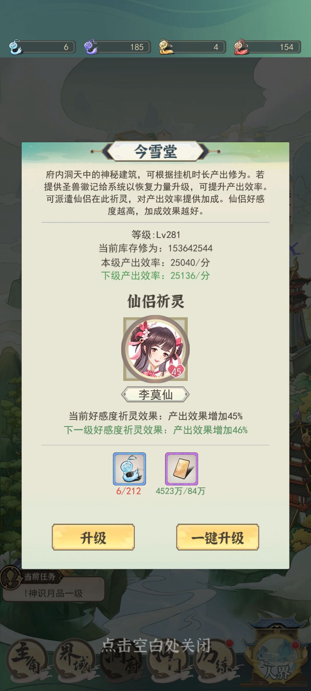 我是情人节入坑的一个小萌新,前前后后玩了一个多月,600多氪,有幸登顶修为榜一。今天,我给大家分享我的修为心得。 一、人界篇 人界有各种新服礼包,用完仙缘码后,会有两万多仙玉。所以,仙玉的分配至关重要。 1、开服礼包只买钥匙礼包,买到买不起为止,有能力可以买完。其他礼包性价比不高。 2.尽量升一个45级的仙友放在今雪堂,这样可以提升45%的修为获取率。 3.斗法荣耀点,都换青龙,因为今雪堂的等级决