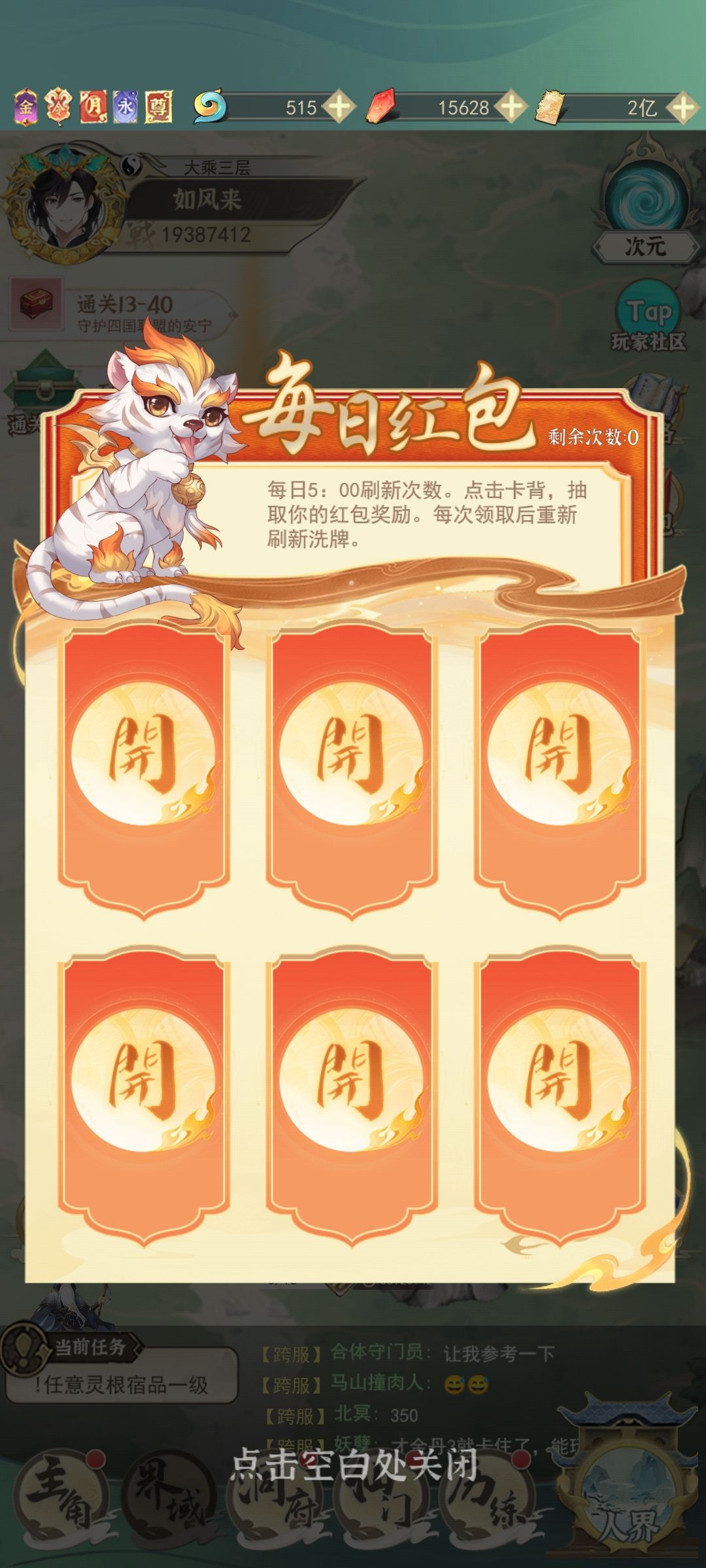 这游戏主打一个资源配置,东西多,又都有点用,玩起来体验还算不错,首先介绍人间的货币,分为灵石,仙玉 ,代币,依次在右上角从右往左,仙玉,代币不要乱花。 1、开局过主线,一定记得去群里领一堆礼包码,领完仙玉,灵石基本都够前期开销了。 装备一键替换就行,很快就会换。精炼,破镜,更换装备都可以继承,优先攻击血量速度。 2、坊市开了以后,人间惊鸿草,人间含光草,四大徽记,虚空石(不要加仙玉买的),果子都加