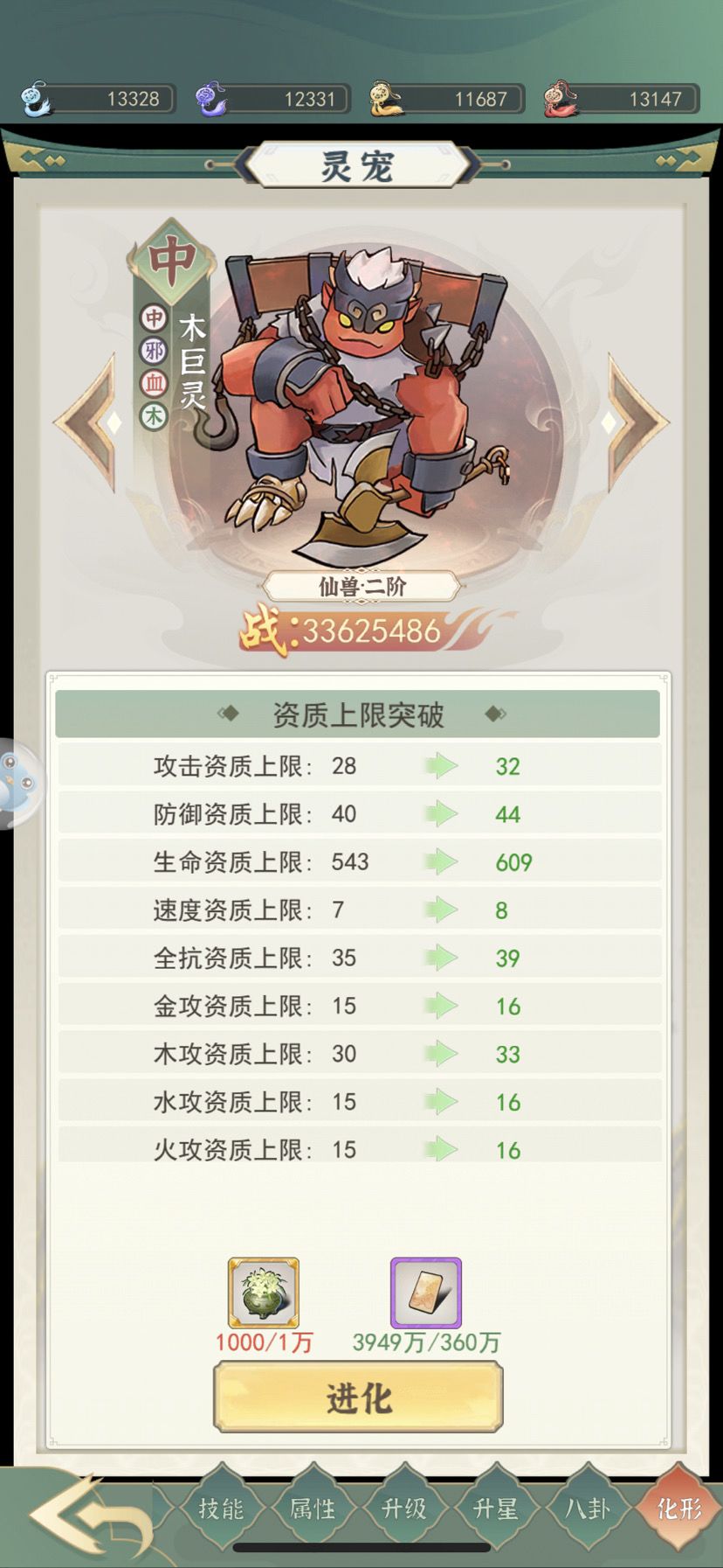化形要十星 仙兽三阶 每日必做坠星海掠夺 尽量多刷一下找到可抢多资源的矿 运气好能抢大几百 升级升黄色灵防