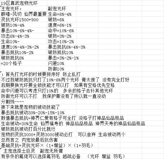 看了好多攻略以及自己玩了这么久整理的一点心得,全文字,耐心看。 1.宠物选择,首选土木巨灵,血高能抗,选其中一只作为主要培养,另外一只随便选,选你的主宠之外的星最高的红色宠物就可以。 2.灵宠池不要随便抽取,等你选择的主宠物UP出来再去抽。 3.然后说一下宠物技能。 副宠:主要是选择增益光环,我们分为前中后期给出推荐。 前期(飞升前):珍品、极品、仙品的(迅捷、坚毅、锋锐) 中期(飞升后):珍品、