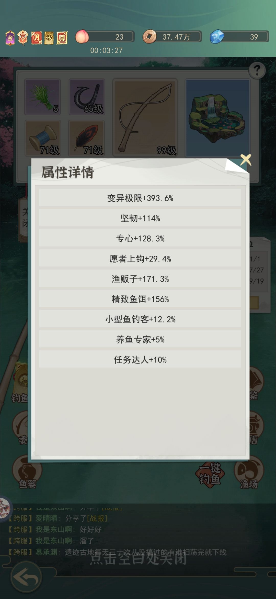 关于钓鱼玩法 钓鱼也这么久了相信大家也踩了各种各样的坑,下面我就来说下钓鱼玩法 钓鱼有15个图,每5个图鱼上升一个境界,属性也差不多是翻4倍,比如1到5图以内都是灵鱼,6到10图是仙鱼,11到15图是神鱼 渔具:鱼钩属性是精致鱼饵是增加鱼饵属性的,比如鱼草是+25%变异极限升级鱼钩后就是25%+25%*精致鱼饵,满级精致鱼饵是+308%,鱼竿属性是增加变异极限就是增加大鱼尺寸上限满级是+236%,