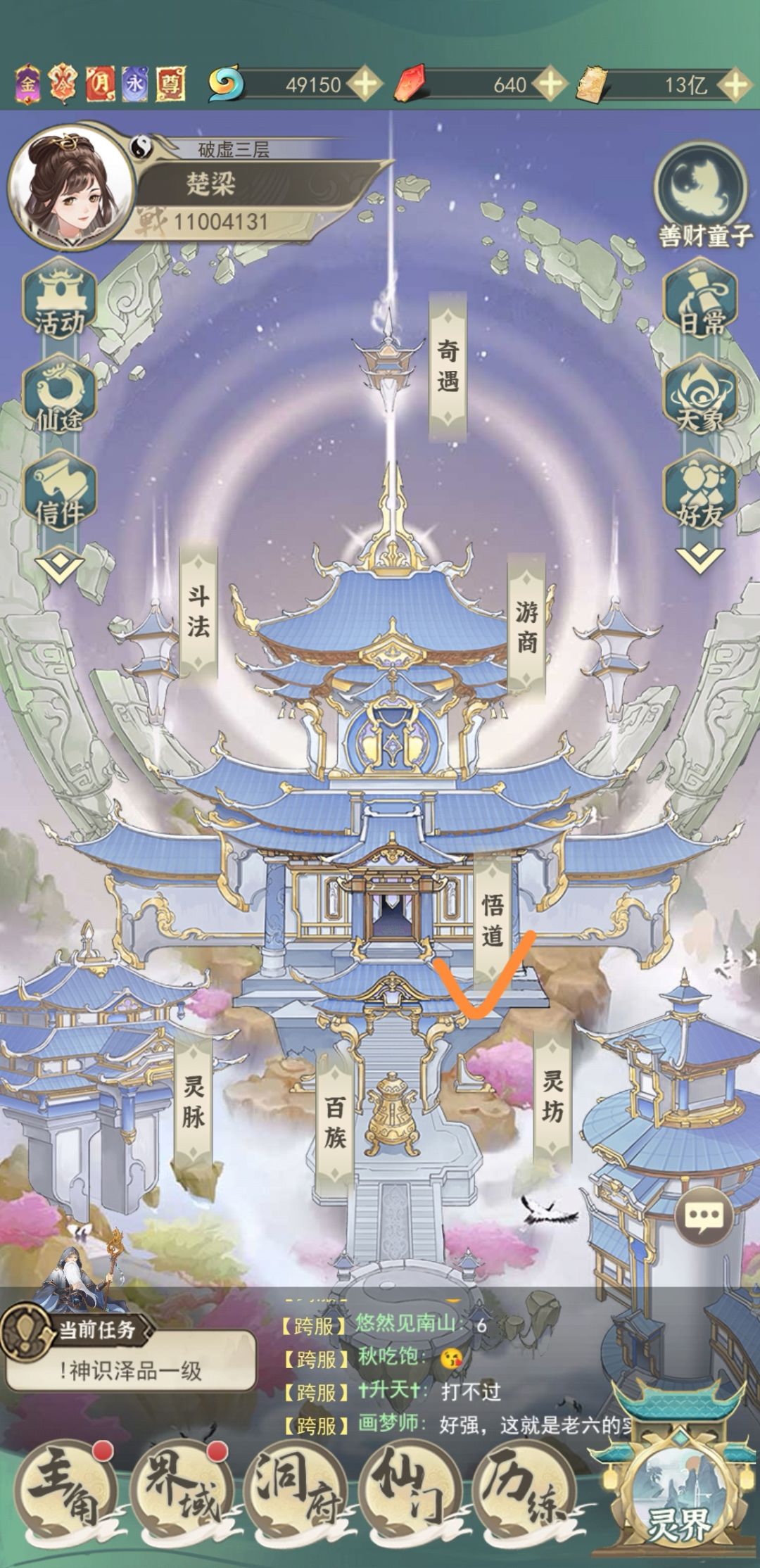 第一天进去,点击左下角的主线任务,跟着任务指引迅速了解基础的游戏功能,领取一环环的任务奖励,然后使用丹药提升修为锻体之类的进度,一直打界域关卡并提升仙侣好感度满足要求接着不断突破到新的界域 期间如果遇到打不过的界域关或者修为啥的卡住不能靠任务奖励突破怎么办,很简单,因为这时候你基本上已经跟着主线任务指引开启了右下角的人界功能,点击进入人界 然后点击左侧一列中的活动一项,打开找到观影阁,进去后可以