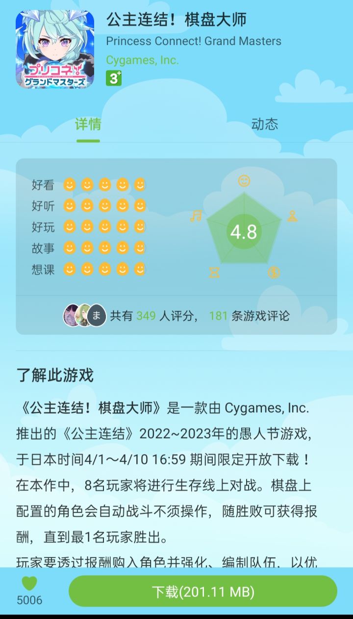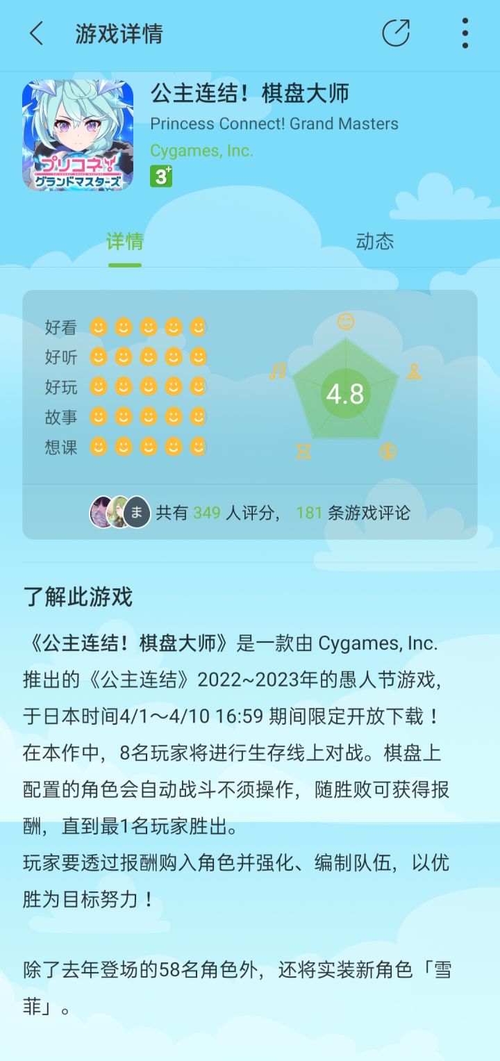 那么首先为大家带来的是《公主连结!Re:Dive》的愚人节活动播报《公主连结!Re:Dive》宣布推出一款自走棋手游《プリコネ!グランドマスターズ(公主连结!Grandmasters)》,开服时间为北京时间4月1日11:00-4月8日15:59。不过现在已经开启海外预下载啦,准备来到奇异的世界,找回失忆的同伴,进行8人战斗吧!