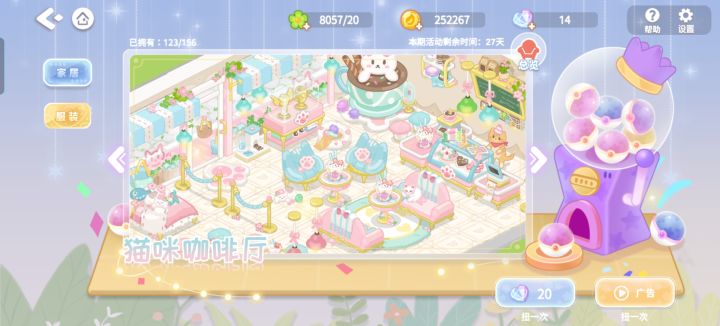 整体是马卡龙色系的装修~超级喜欢紫藤花这个房型家具还可以互动真的很喜欢,服装也很多期待更新