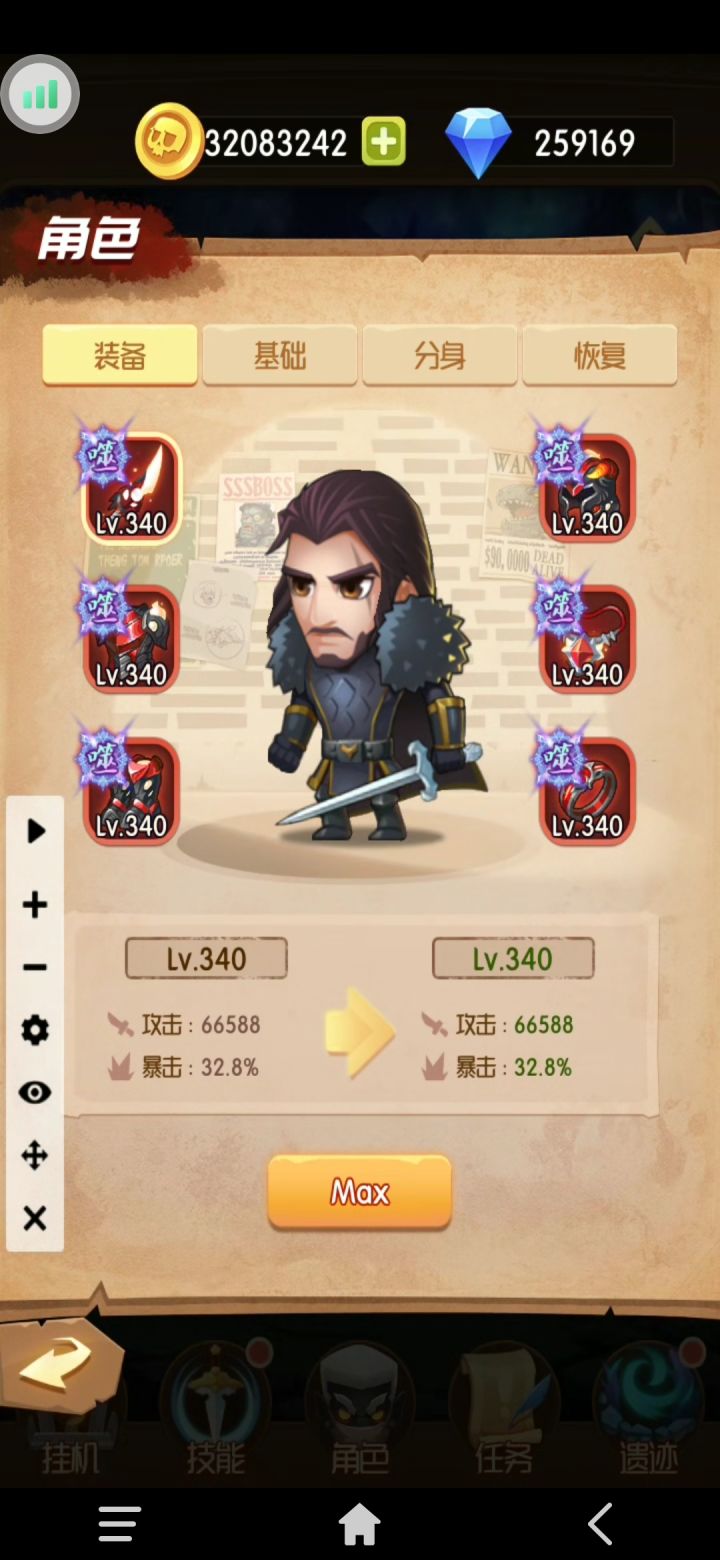 前期钻石不要抽宝箱,钻石优先升级装备,装备满级340级,大约26万钻石
