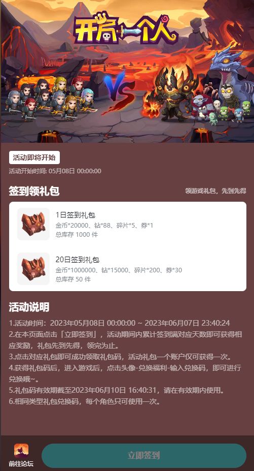耶!宠粉福利又来啦!签到领福利~快到碗里来! 签到活动即将上线~ 论坛里多多发帖,为咱们的小小家园添砖加瓦吧!! 领游戏礼包,先到先得哦! 活动开始时间:5月8日00:00 💖礼包内容: 1日签到礼包:金币*20000、钻*88、碎片*5、券*1 20日签到礼包:金币*1000000、钻*15000、碎片*200、券*30 注意事项: 1.活动时间:2023年05月08日 00:00:00 ~ 2